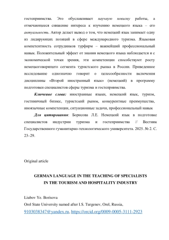 Изучается туристическая отрасль Германии и интерес к ней со стороны россиян, определяются иноязычные языковые компетенции, необходимые для работы с иностранными туристами.
