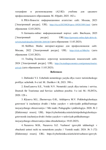 7. Осипян Л.Г., Тканова А.В. Немецкий язык для изучающих туризм, географию и регионоведение (A2-B2): учебник для среднего профессионального образования. М.: Юрайт, 2025. 182 с.