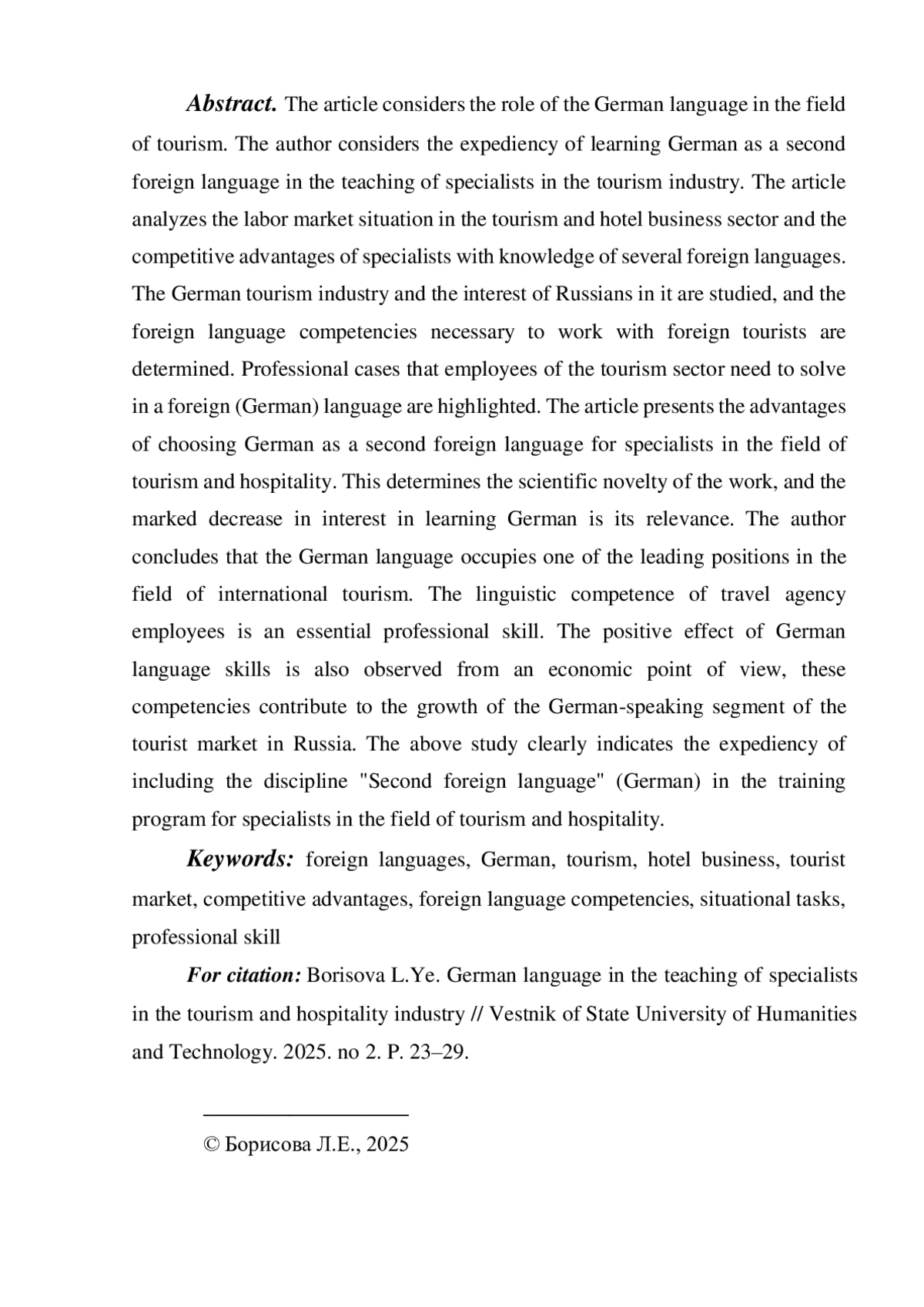 Автор делает вывод о том, что немецкий язык занимает одну из лидирующих позиций в сфере международного туризма. Языковая компетентность сотрудников турфирм - важнейший профессиональный навык. Положительный эффект от знания немецкого языка наблюдается и с экономической точки зрения, эти компетенции способствуют росту немецкоговорящего сегмента туристского рынка в России.