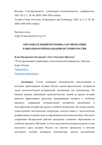 10. Первушкин Т.В. Методика применения нумизматических источников на уроках истории // Лебедевские чтения. Сборник статей по материалам XXII Всероссийской научно-практической конференции, посвященной 180-летию со дня рождения В.О. Ключевского / под ред. О.А. Суховой. Пенза: Пензенский государственный университет, 2021. С. 448-452. EDN: QJPEMI