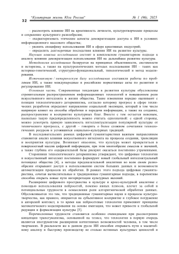 Авторы статьи исследуют влияние демократизации доступа к искусственному интеллекту на современную культуру и креативные индустрии. Проанализированы исторические этапы развития искусственного интеллекта, его роль в трансформации творческих процессов и сохранении культурного многообразия. Особое внимание уделено этическим аспектам использования искусственного интеллекта в творчестве, проблемам авторства, а также рискам доминирования глобальных платформ, обусловливающим процессы унификации культуры