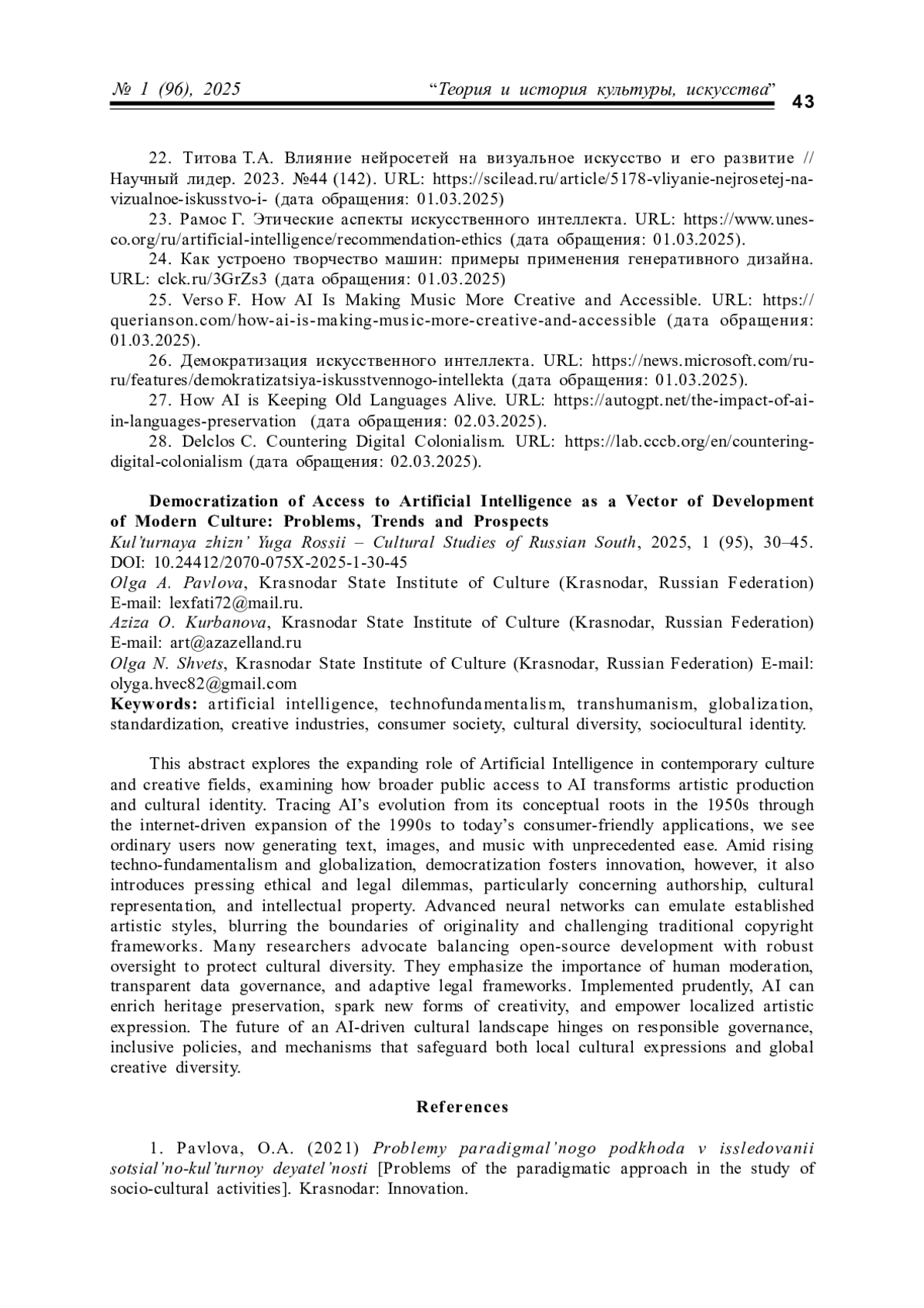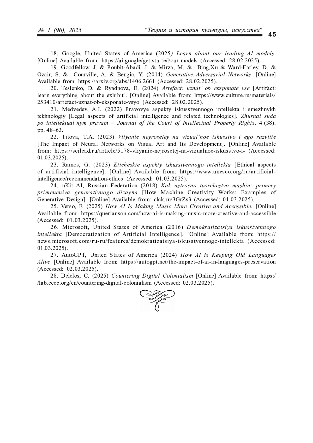 5. Атреянов А. Профессор Сколтеха рассказал, какую угрозу для культуры создает искусственный интеллект. URL: https://sk.ru/news/professor-skolteha-rasskazal-kakuyu-ugrozu-dlya-kultury-sozdaet-iskusstvennyy-intellekt (дата обращения: 20.02.2025).