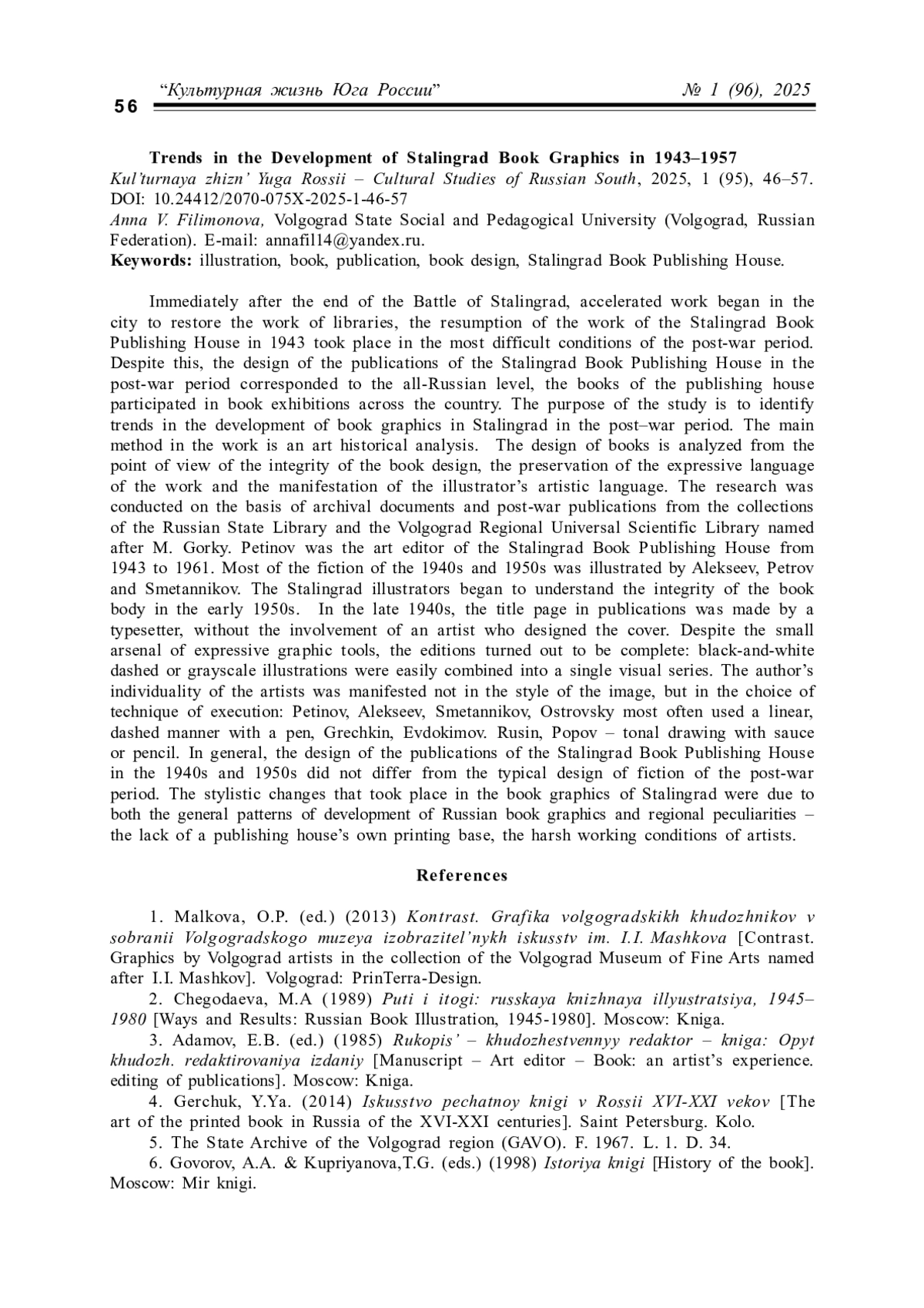 Актуальность темы исследования. В послевоенный период, когда Сталинград активно восстанавливался, областное книжное издательство начало выпускать художественно оформленные издания еще до проведения первых художественных выставок. Однако, несмотря на многолетнюю работу художников-иллюстраторов, первая специализированная выставка книжной графики «Художник и книга» прошла только в 1996 году, через 60 лет после основания Сталинградского книжного издательства. Последующие выставки книжной графики были проведены уже после закрытия Нижне-Волжского издательства в 2019, 2022 и 2023 гг. П