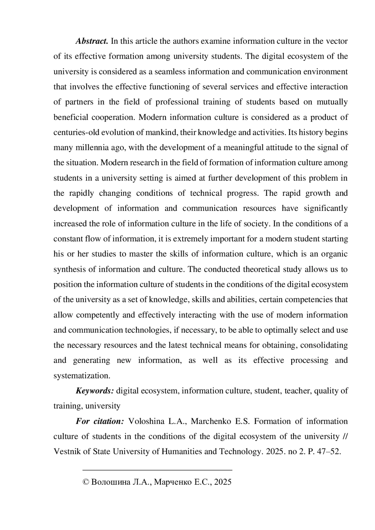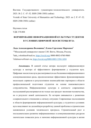 В условиях постоянного потока информации современному студенту, начинающему обучение, крайне важно овладеть навыками информационной культуры, которая представляет собой органический синтез информации и культуры. Проведенное теоретическое исследование позволяет позиционировать информационную культуру студентов в условиях цифровой экосистемы вуза как совокупность знаний, умений и навыков, определенных компетенций, позволяющих грамотно и результативно взаимодействовать с использованием современных информационных и коммуникационных технологий, по необходимости уметь оптимально выбрать и пользоваться необходимыми ресурсами и новейшими техническими средствами для получения, консолидации и генерации новой информации, а также её эффективной обработки и систематизации.