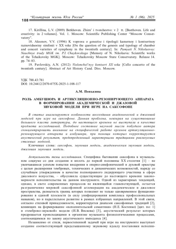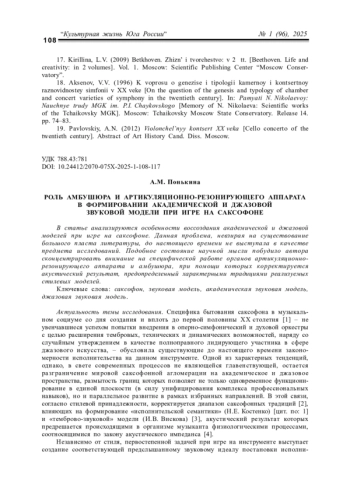2. Понькина А.М. Русские саксофонные традиции: к проблеме генезиса // Образование и культурное пространство. 2024. № 1. С. 96-104. EDN: NINKMO