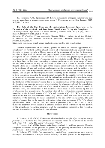 19. Понькина А.М., Григорьев Е.В. Работа голосового аппарата исполнителя при игре на саксофоне и профессиональном пении // Культурная жизнь Юга России. 2017. № 3(66). С. 45-49. EDN: ZRAHWN