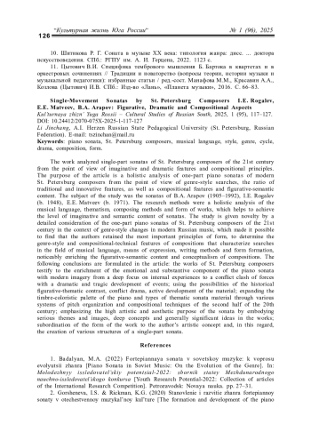 ЛИ Ц. ОДНОЧАСТНЫЕ СОНАТЫ ПЕТЕРБУРГСКИХ КОМПОЗИТОРОВ И. Е. РОГАЛЕВА, Э. Е. МАТВЕЕВА, Б. А. АРАПОВА: ОБРАЗНО-ДРАМАТУРГИЧЕСКИЕ И КОМПОЗИЦИОННЫЕ АСПЕКТЫ // КУЛЬТУРНАЯ ЖИЗНЬ ЮГА РОССИИ. 2025. № 1 (96)