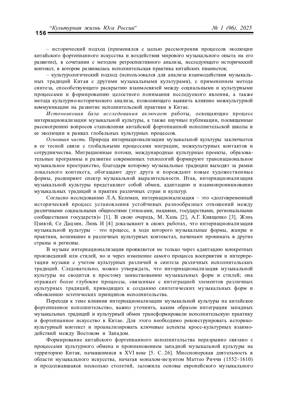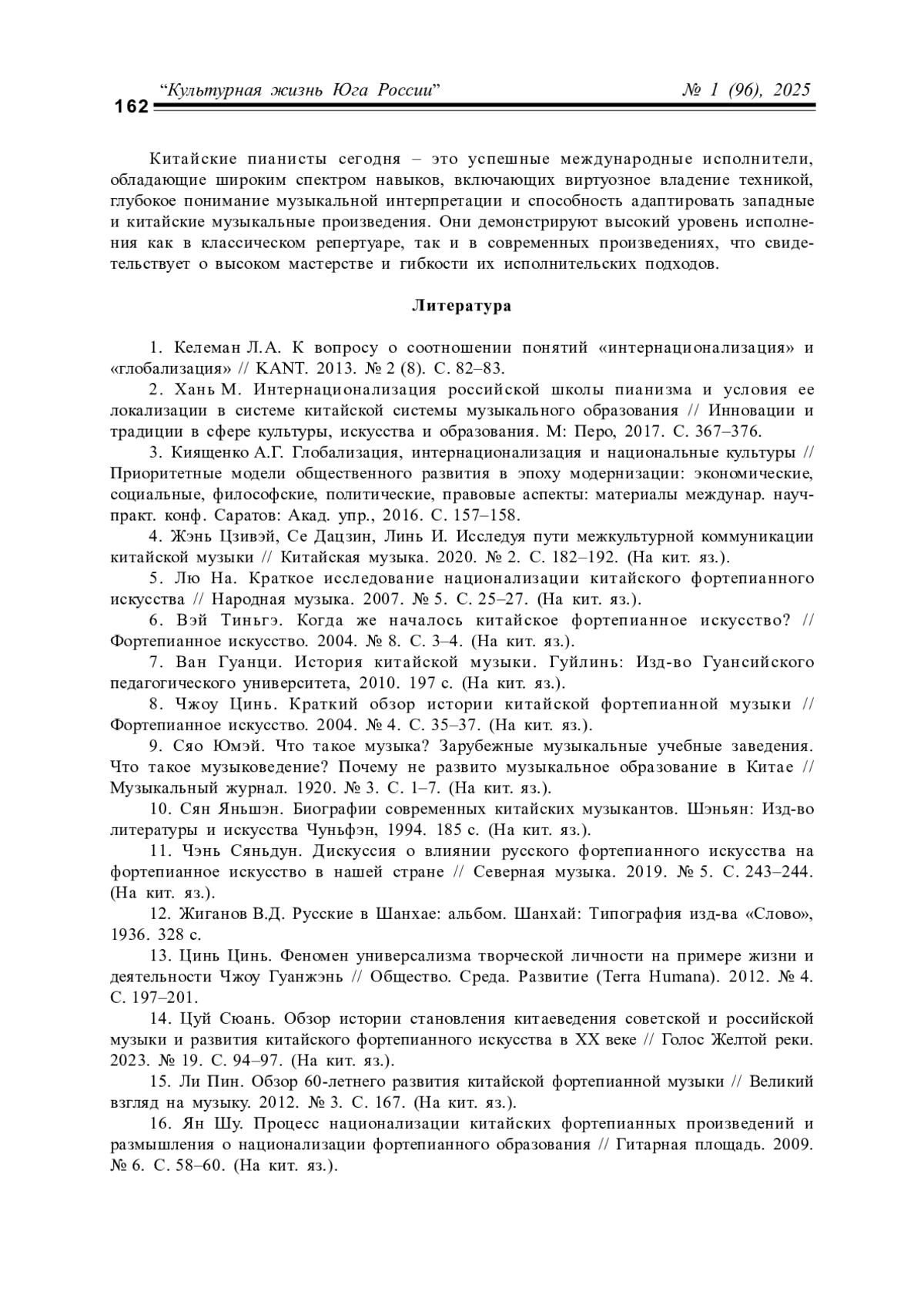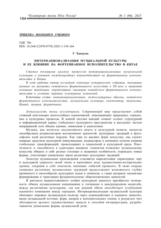 У Х. ИНТЕРНАЦИОНАЛИЗАЦИЯ МУЗЫКАЛЬНОЙ КУЛЬТУРЫ И ЕЕ ВЛИЯНИЕ НА ФОРТЕПИАННОЕ ИСПОЛНИТЕЛЬСТВО В КИТАЕ // КУЛЬТУРНАЯ ЖИЗНЬ ЮГА РОССИИ. 2025. № 1 (96)