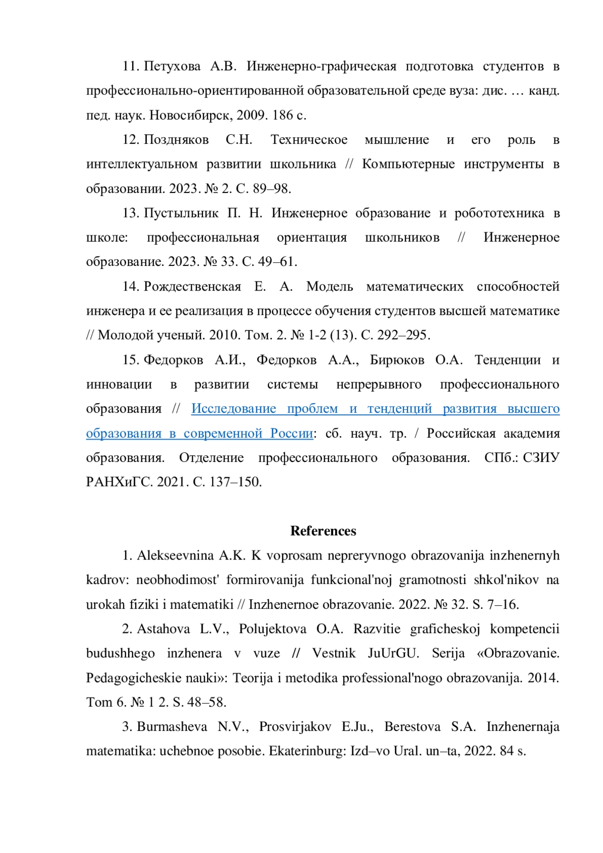 15. Федорков А.И., Федорков А.А., Бирюков О.А. Тенденции и инновации в развитии системы непрерывного профессионального образования // Исследование проблем и тенденций развития высшего образования в современной России: сб. науч. тр. / Российская академия образования. Отделение профессионального образования. СПб.: СЗИУ РАНХиГС. 2021. С. 137-150. EDN: IIDDCR