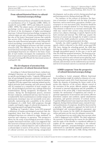 Диагноз синдрома дефицита внимания и гиперактивности (СДВГ) был предметом постоянных дискуссий, при этом многочисленные дискуссии оспаривали его обоснованность и ставили под сомнение доказательства, подтверждающие его существование. Эта статья тщательно исследует дебаты о СДВГ, используя призму культурно-исторической нейропсихологии. Эта конкретная концепция глубоко укоренена в культурно-исторической теории, разработанной такими выдающимися учеными, как Выготский, Лурия и Леонтьев. В статье кратко излагаются теоретические основы культурноисторической нейропсихологии и продолжается обсуждение вопросов развития внимания с позиций культурно-исторической теории. Критически обсуждаются симптомы СДВГ и иллюстрируются сравнительные преимущества культурно-исторической нейропсихологии. Авторы решительно выступют за смену парадигмы от традиционного диагностического подхода к подходу, основанному на культурно-исторических нейропсихологических принципах. Утверждается, что этот подход обеспечивает более персонализированную, объяснительную и целостную перспективу, которая лучше подходит для решения и понимания трудностей, связанных с СДВГ. Эта система учитывает уникальные потребности каждого ребенка, предлагая комплексный и индивидуальный подход к его конкретным обстоятельствам.