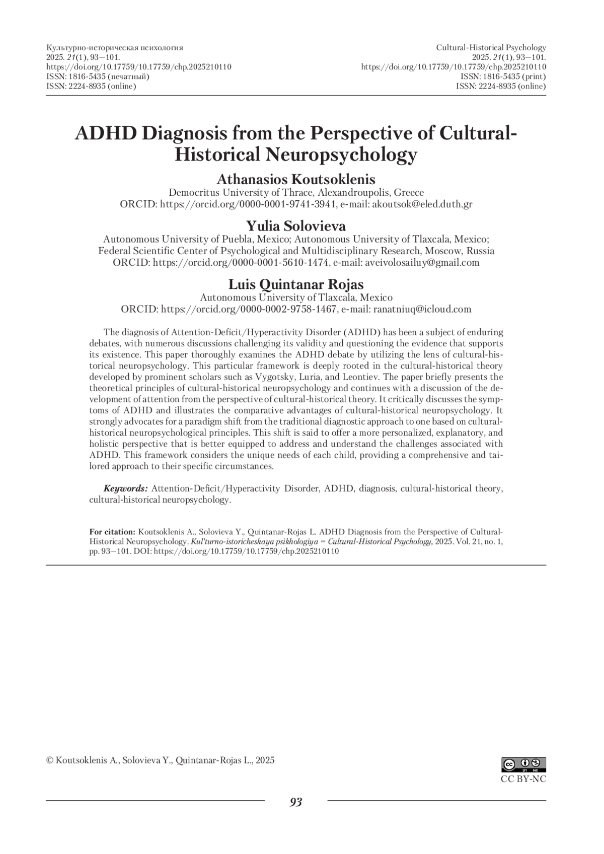 43. Solovieva Y., Koutsoklenis A., Quintanar L. Neuropsychological assessment of difficulties in reading Spanish: A cultural-historical approach. Psychology in Russia: State Art, 2021. Vol.14, no.4, pp.51-65. DOI: 10.11621/pir.2021.0404