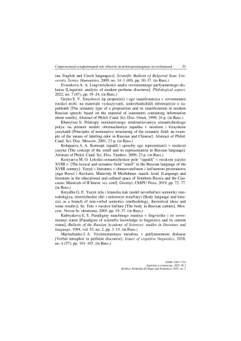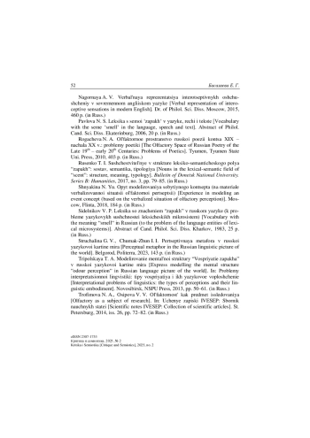 17. Русенко Т. И. Существительные в структуре лексико-семантического поля “запах”: состав, семантика, типология // Вестник Донец. нац. ун-та. Серия Б: Гуманитарные науки. 2017. № 3. С. 79-85.