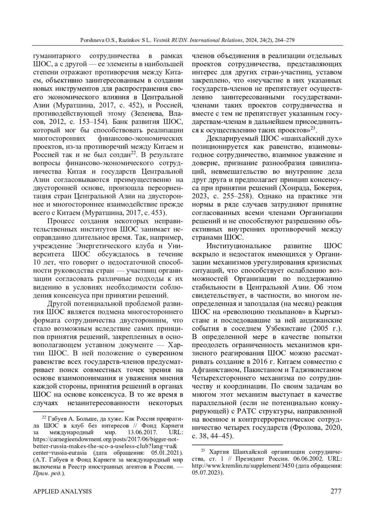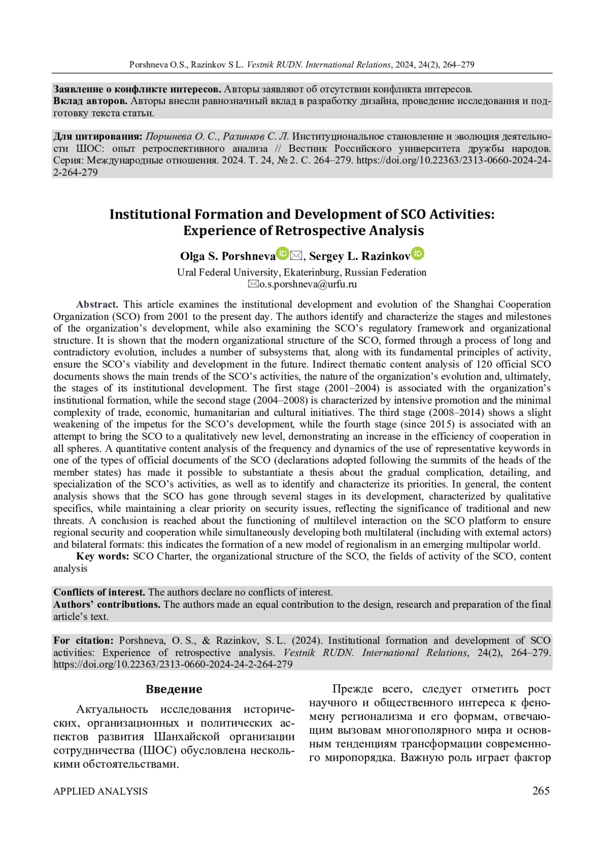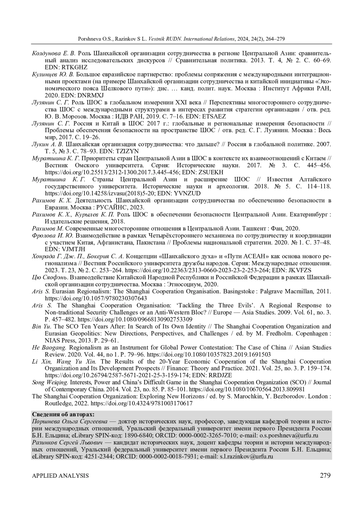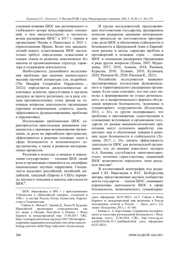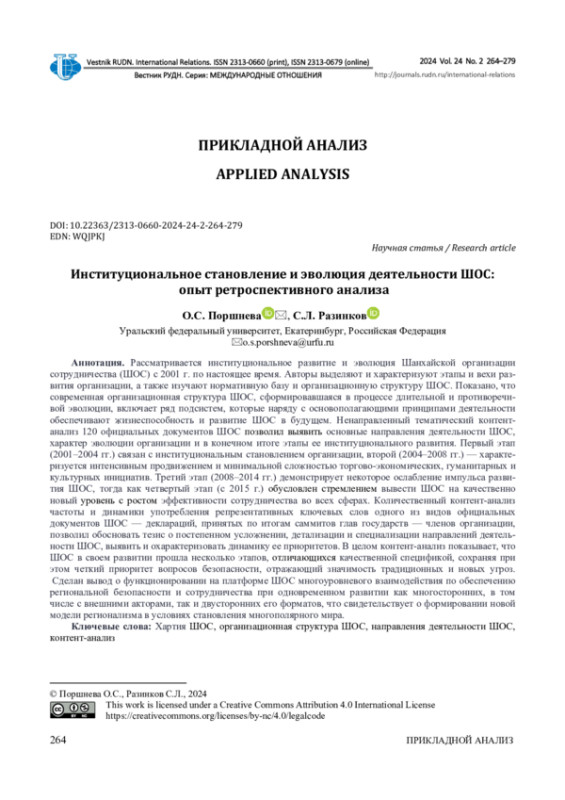 ПОРШНЕВА О. С., РАЗИНКОВ С. Л. ИНСТИТУЦИОНАЛЬНОЕ СТАНОВЛЕНИЕ И ЭВОЛЮЦИЯ ДЕЯТЕЛЬНОСТИ ШОС: ОПЫТ РЕТРОСПЕКТИВНОГО АНАЛИЗА // ВЕСТНИК РОССИЙСКОГО УНИВЕРСИТЕТА ДРУЖБЫ НАРОДОВ. СЕРИЯ: МЕЖДУНАРОДНЫЕ ОТНОШЕНИЯ. 2024. ТОМ 24 № 2