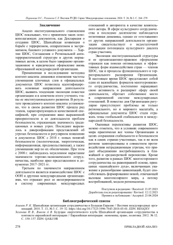 Статья: ИНСТИТУЦИОНАЛЬНОЕ СТАНОВЛЕНИЕ И ЭВОЛЮЦИЯ ДЕЯТЕЛЬНОСТИ ШОС: ОПЫТ РЕТРОСПЕКТИВНОГО АНАЛИЗА (2024)