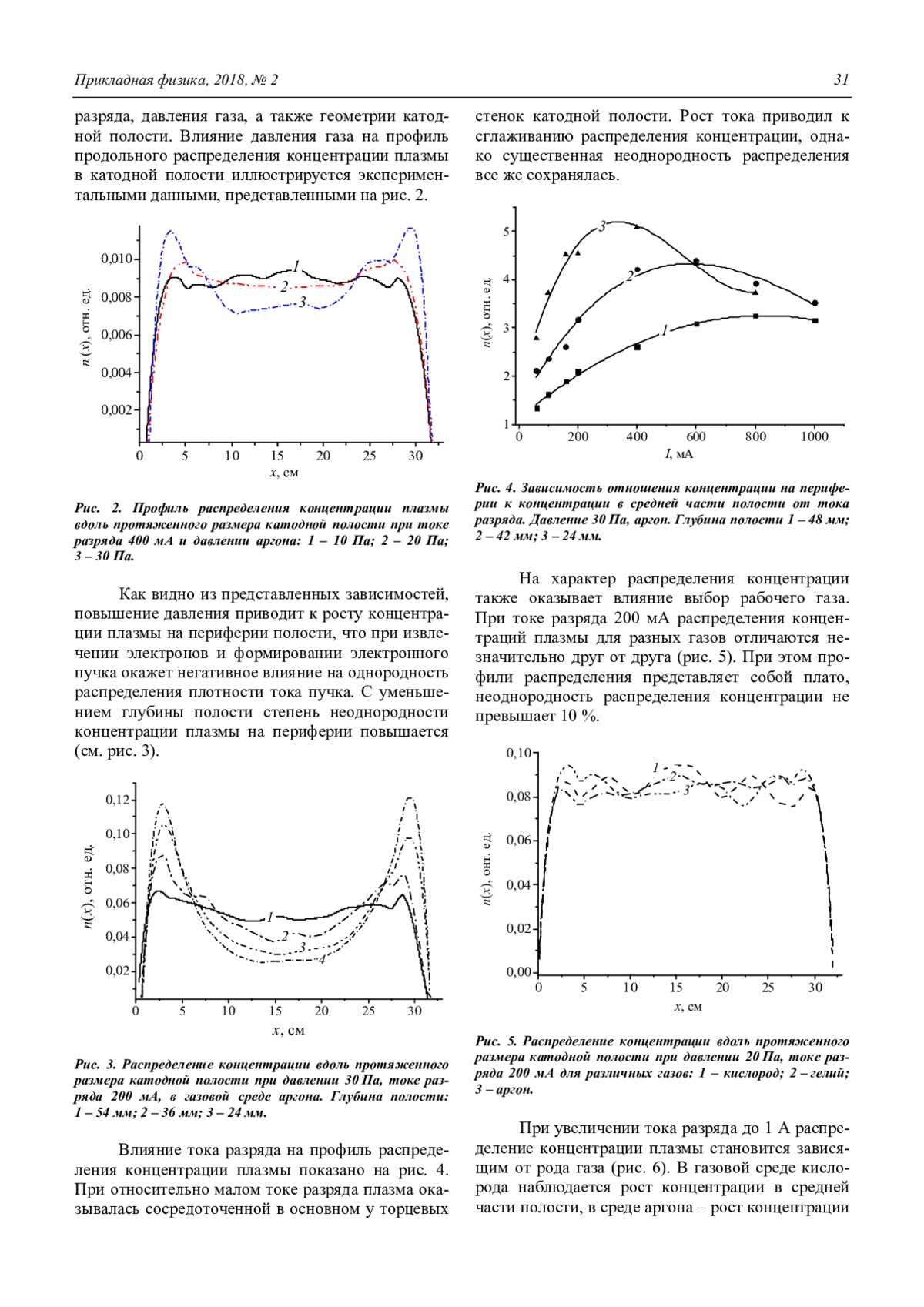 Для разрядной системы с протяженным полым катодом, используемой в форвакуумном плазменном источнике ленточного электронного пучка, исследовано влияния геометрии катодной полости и рода плазмообразующего газа на однородность распределение концентрации плазмы в области эмиссионной границы. Показано, что наибольшее влияние на однородность распределения концентрации эмиссионной плазмы оказывает геометрические параметры разрядного промежутка электронного источника. При оптимальной геометрии разрядной системы определен диапазон токов разряда, давления и рода газа, обеспечивающие неоднородность распределения концентрации плазмы не более 20 % от среднего значения.