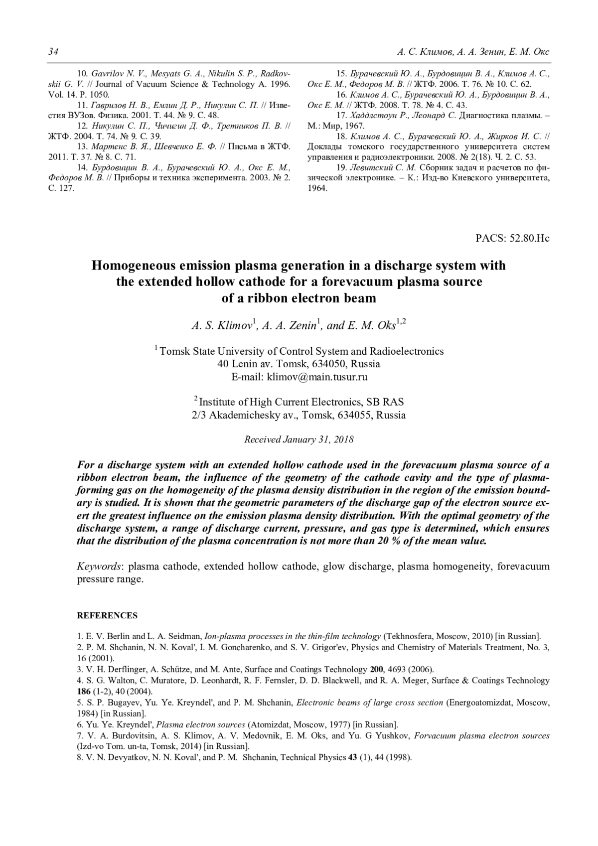 A. S. Klimov, A. A. Zenin, and E. M. Oks Homogeneous emission plasma generation in a discharge system with the extended hol-low cathode for a forevacuum plasma source of a ribbon electron beam 29