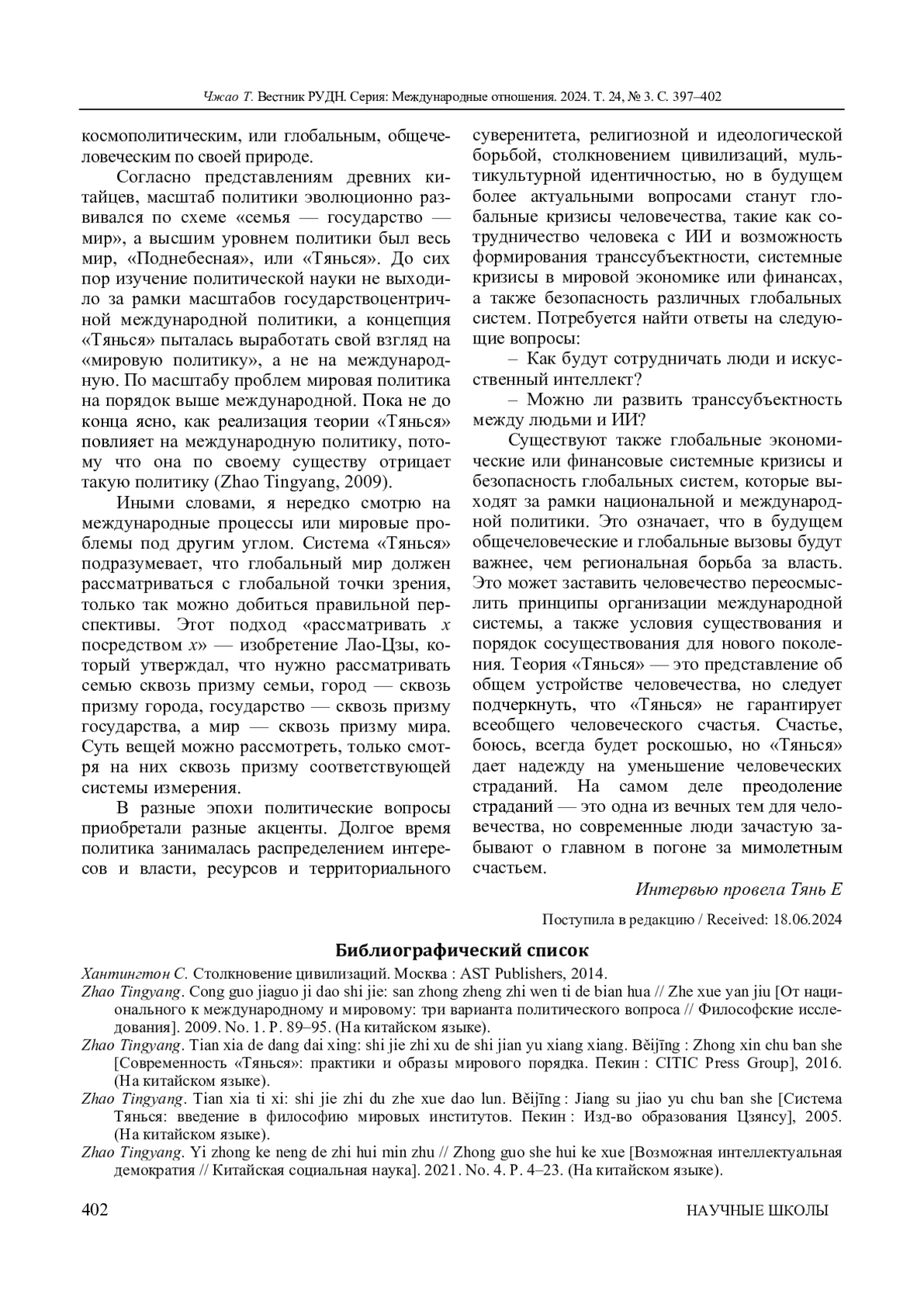 2. Zhao Tingyang. Cong guo jiaguo ji dao shi jie: san zhong zheng zhi wen ti de bian hua // Zhe xue yan jiu [От национального к международному и мировому: три варианта политического вопроса // Философские исследования]. 2009. No. 1. P. 89-95. (На китайском языке).