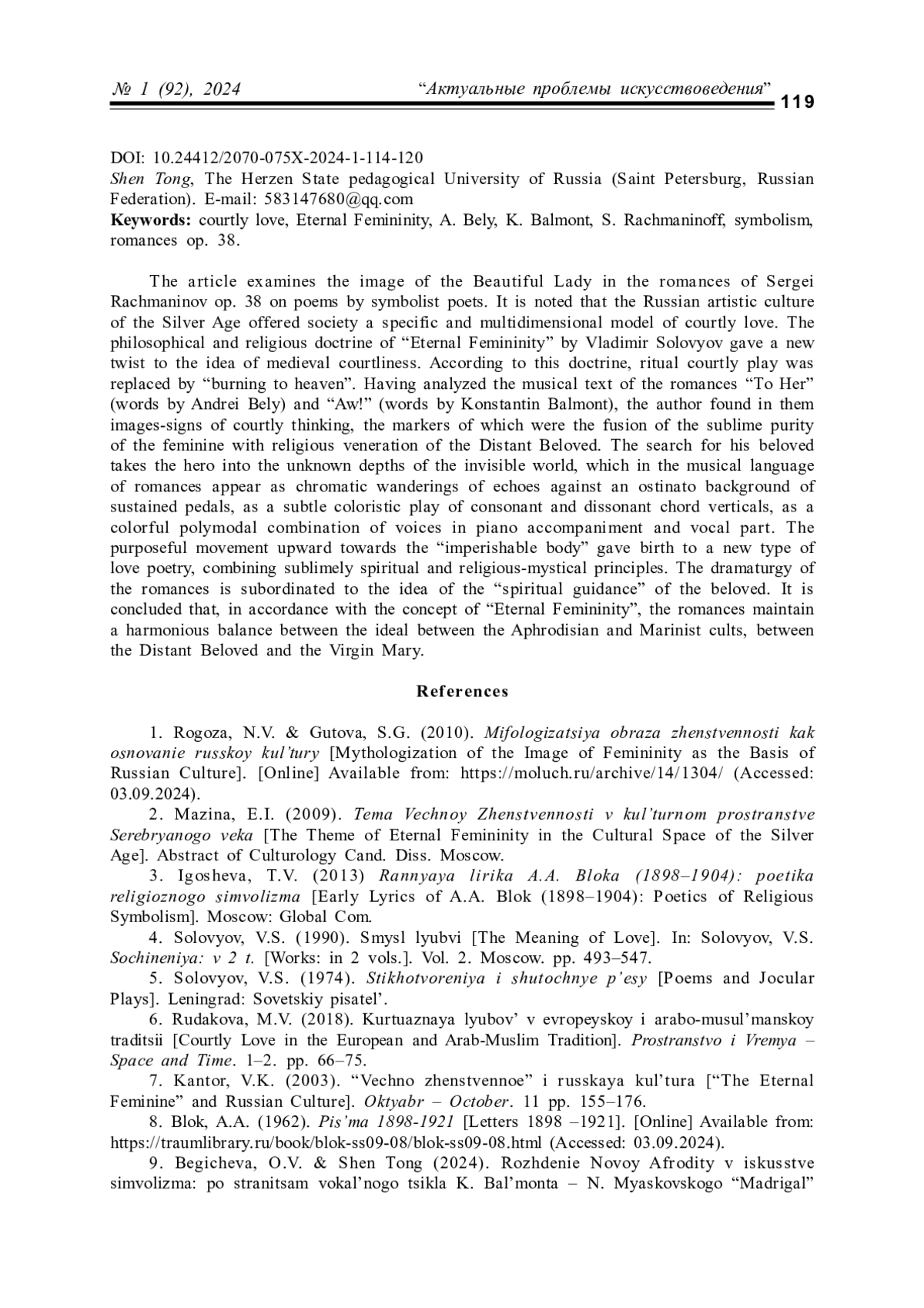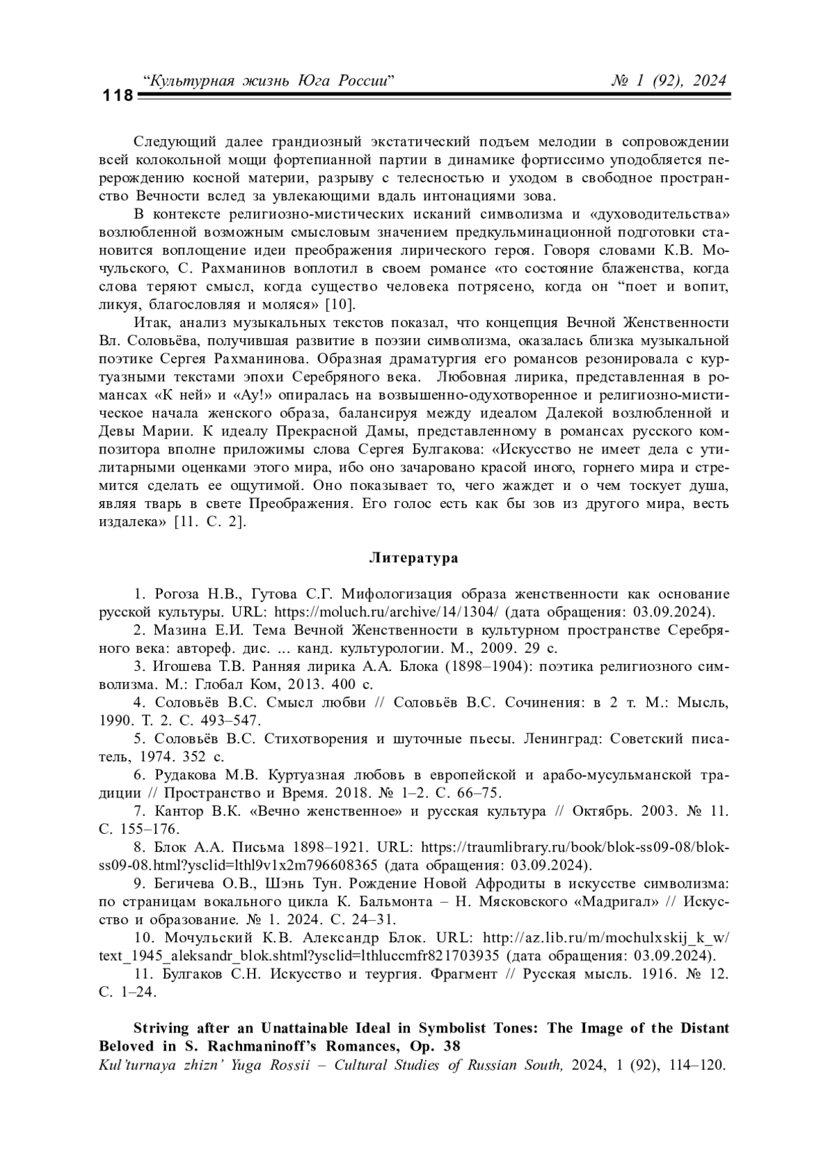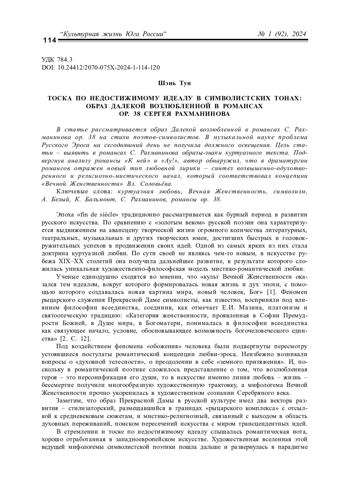 ШЭНЬ Т. ТОСКА ПО НЕДОСТИЖИМОМУ ИДЕАЛУ В СИМВОЛИСТСКИХ ТОНАХ: ОБРАЗ ДАЛЕКОЙ ВОЗЛЮБЛЕННОЙ В РОМАНСАХ ОР. 38 СЕРГЕЯ РАХМАНИНОВА // КУЛЬТУРНАЯ ЖИЗНЬ ЮГА РОССИИ. 2024. № 1 (92)