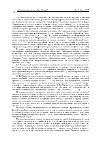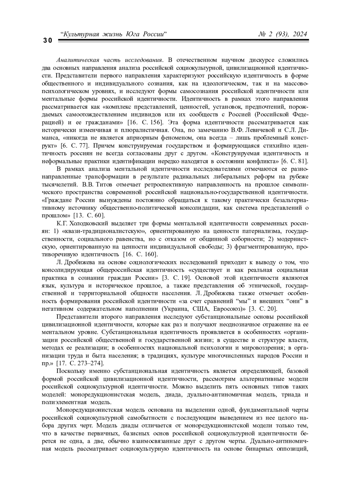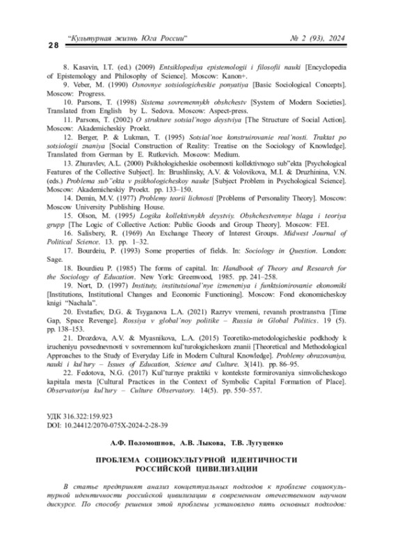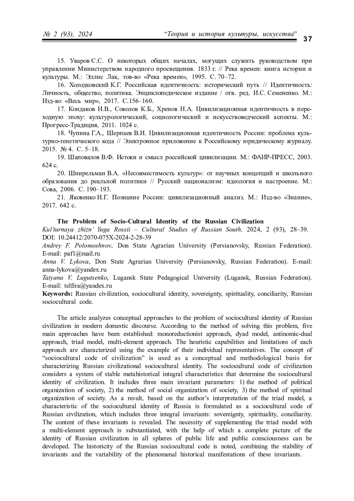 ПОЛОМОШНОВ А. Ф., ЛЫКОВА А. В., ЛУГУЦЕНКО Т. В. ПРОБЛЕМА СОЦИОКУЛЬТУРНОЙ ИДЕНТИЧНОСТИ РОССИЙСКОЙ ЦИВИЛИЗАЦИИ // КУЛЬТУРНАЯ ЖИЗНЬ ЮГА РОССИИ. 2024. № 2 (93)