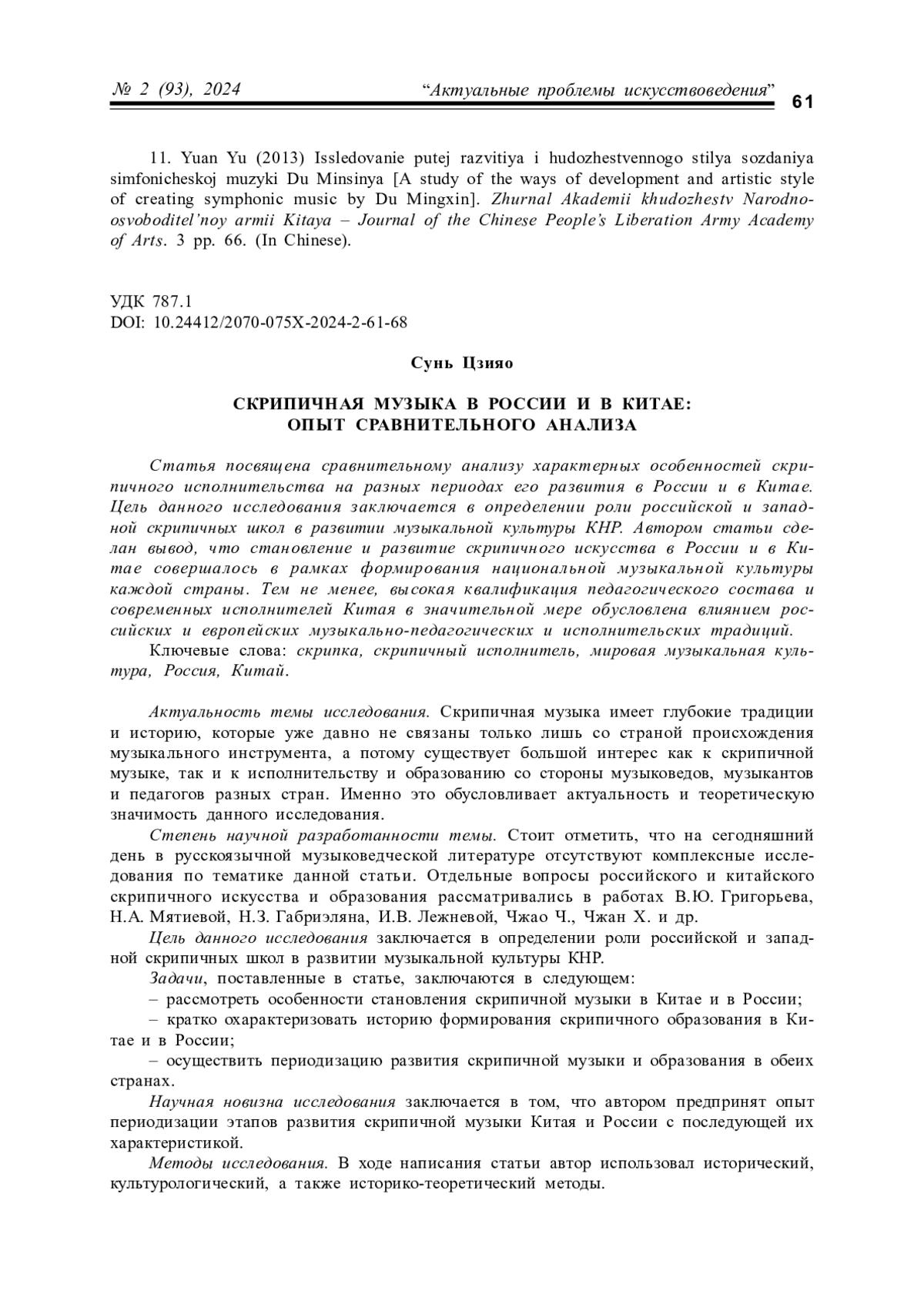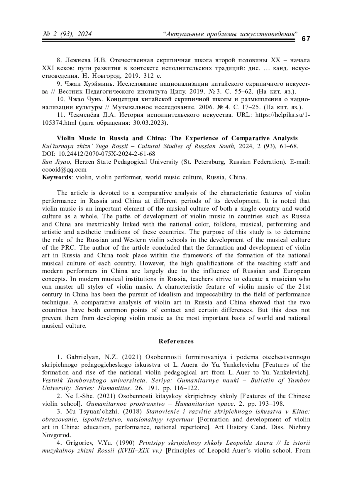 9. Чжан Хуэйминь. Исследование национализации китайского скрипичного искусства // Вестник Педагогического института Цилу. 2019. № 3. С. 55-62. (На кит. яз.).