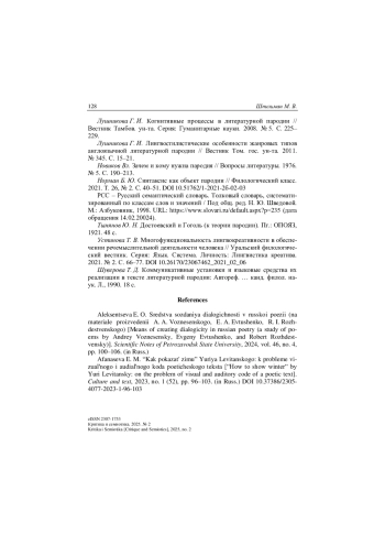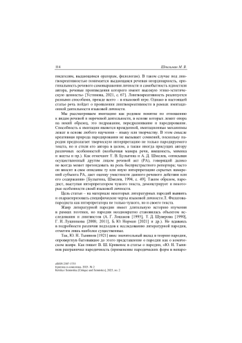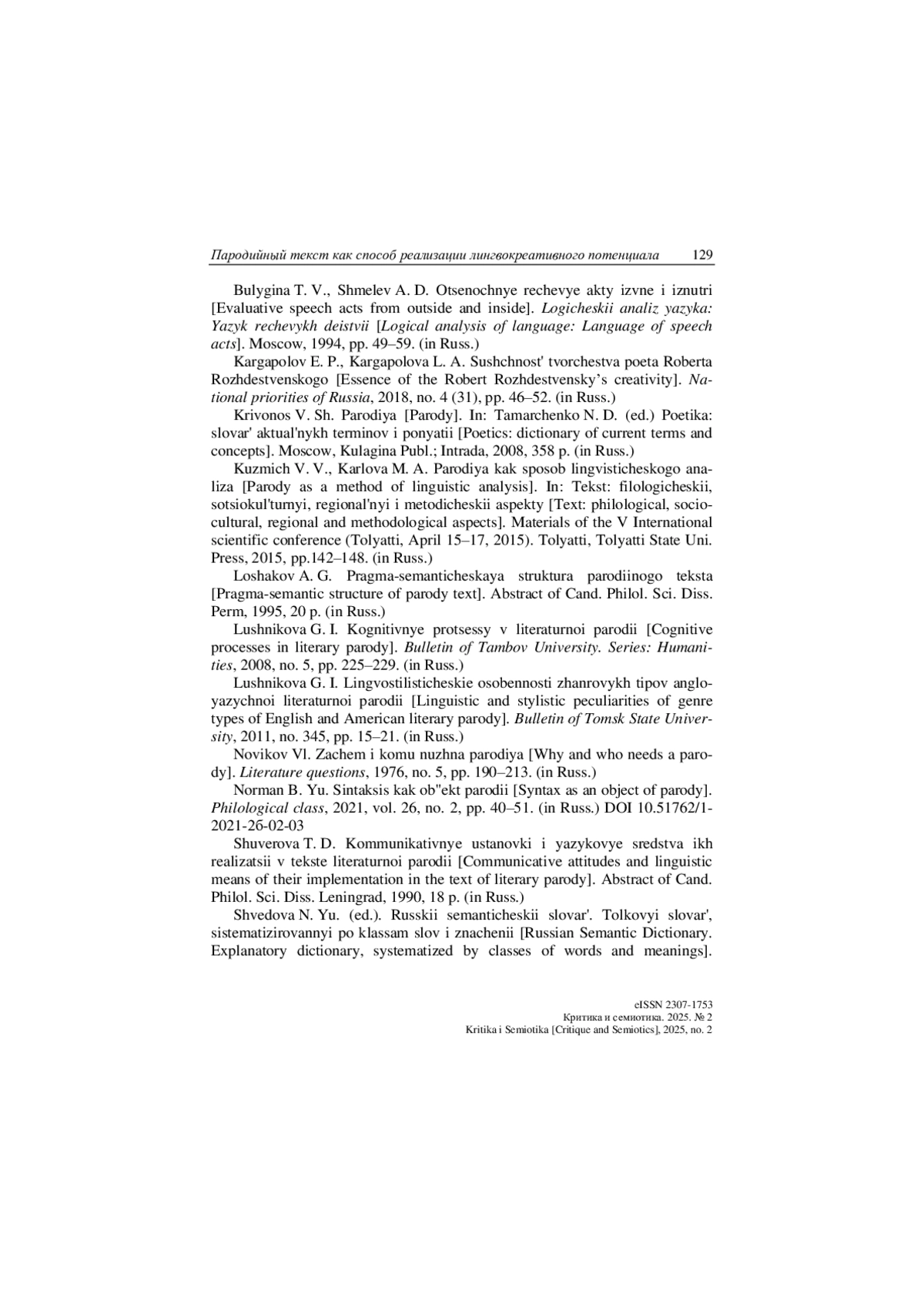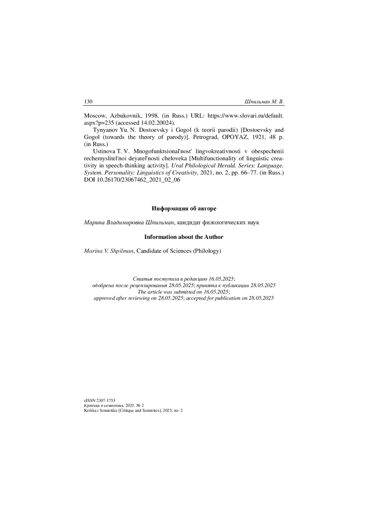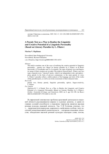 ШПИЛЬМАН М. В. ПАРОДИЙНЫЙ ТЕКСТ КАК СПОСОБ РЕАЛИЗАЦИИ ЛИНГВОКРЕАТИВНОГО ПОТЕНЦИАЛА ЯЗЫКОВОЙ ЛИЧНОСТИ (НА МАТЕРИАЛЕ ЛИТЕРАТУРНЫХ ПАРОДИЙ Л. ФИЛАТОВА) // КРИТИКА И СЕМИОТИКА. 2025. № 2