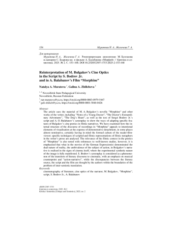 На материале повести-рассказа М. А. Булгакова «Морфий» и других произведений писателя, а также текста сценария С. Бодрова-мл. и экранизации А. О. Балабанова показываются способы адаптации специфических черт кинопоэтики Булгакова в экранных нарративах. Рассматривается, как внутренняя структура дискурса записей в «Морфии» апеллирует к намеренным элементам визуализации, анализируются конкретные приемы сценарной и кинематографической версий репрезентации кинометафор в прозе писателя. Расхождения между литературным источником, сценарием и кинофильмом исследуются в границах проблемы межсемиотического перевода, демонстрируется, как киноверсия Балабанова предлагает зрителю финальную стадию трансформации элементов кинооптики.