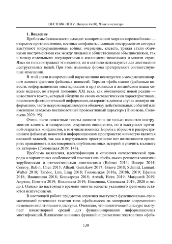 11. Никонова Ж. В., Соловьева Е. В. Проблемные вопросы лингвистического анализа текстов типа “фейк-ньюс” (на примере немецкого политического дискурса) // Вестник Нижегородского государственного лингвистического университета им. Н.А. Добролюбова. Спецвыпуск, 2020. С. 93-102.