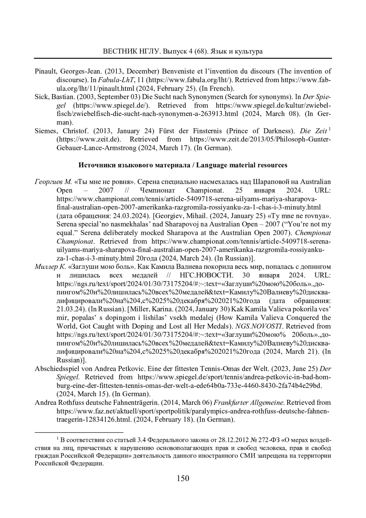 ЩЕРБИНА Т. С. АНТОНОМАЗИЙНЫЕ КОМПЛЕКСЫ В РЕПРЕЗЕНТАЦИИ СПОРТСМЕНОК В НЕМЕЦКОМ МЕДИЙНОМ СПОРТИВНОМ ДИСКУРСЕ // ВЕСТНИК НИЖЕГОРОДСКОГО ГОСУДАРСТВЕННОГО ЛИНГВИСТИЧЕСКОГО УНИВЕРСИТЕТА ИМ. Н. А. ДОБРОЛЮБОВА. 2024. № 68