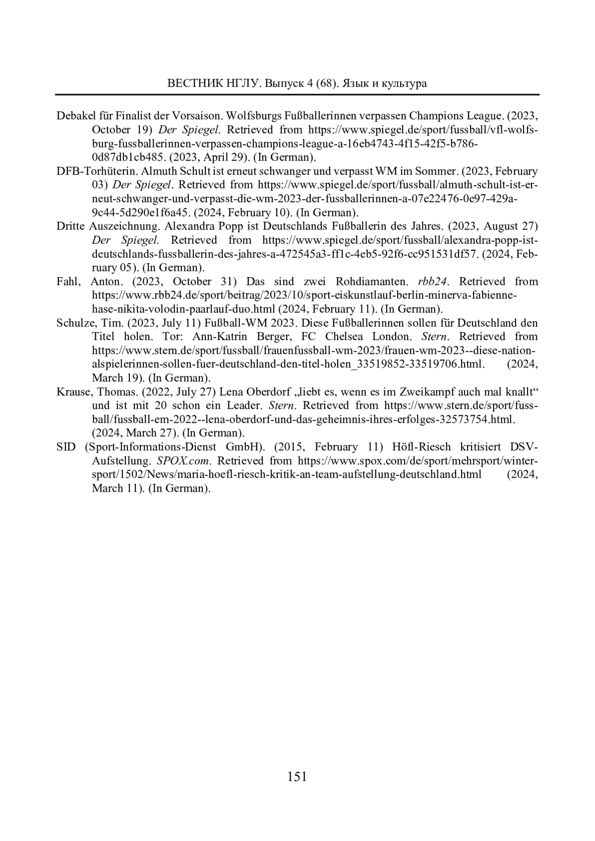 Статья: АНТОНОМАЗИЙНЫЕ КОМПЛЕКСЫ В РЕПРЕЗЕНТАЦИИ СПОРТСМЕНОК В НЕМЕЦКОМ МЕДИЙНОМ СПОРТИВНОМ ДИСКУРСЕ (2024)