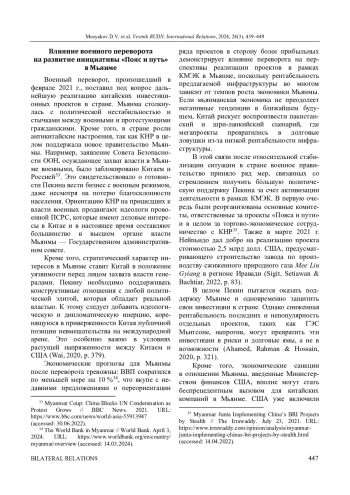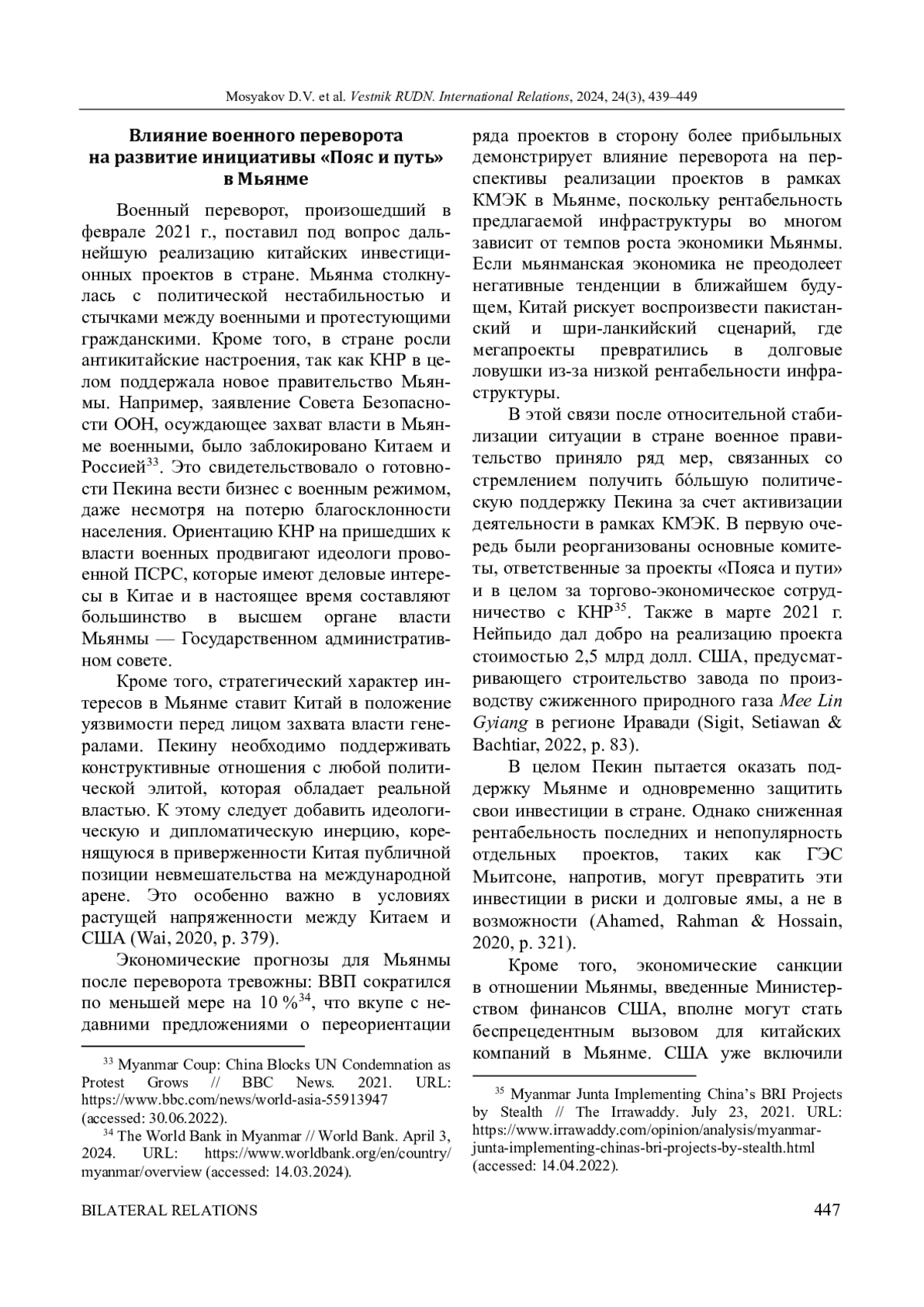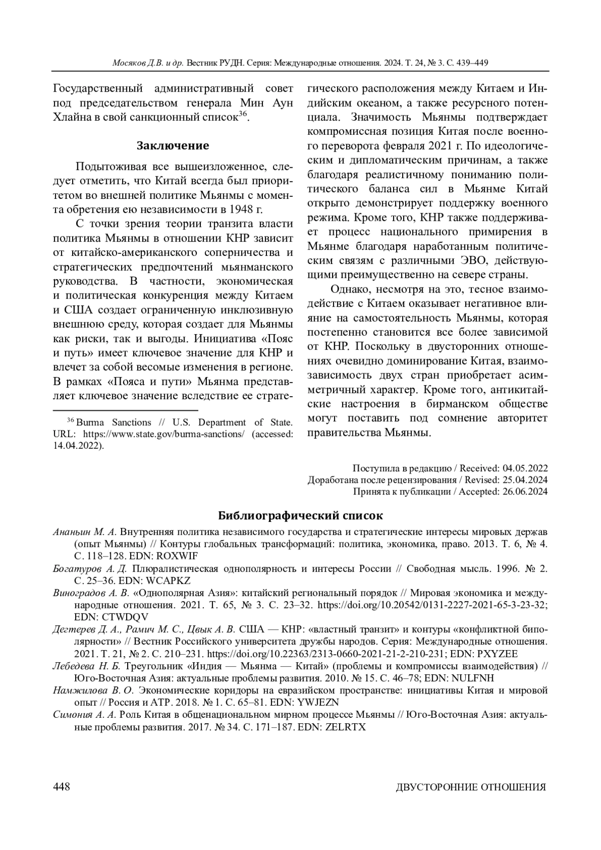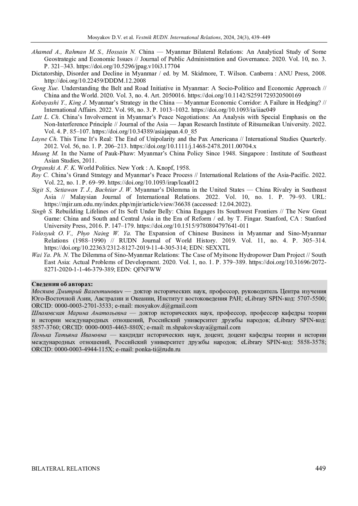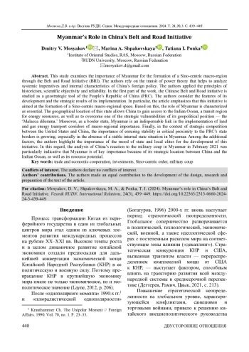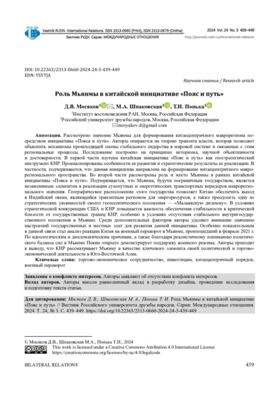 МОСЯКОВ Д. В., ШПАКОВСКАЯ М. А., ПОНЬКА Т. И. РОЛЬ МЬЯНМЫ В КИТАЙСКОЙ ИНИЦИАТИВЕ "ПОЯС И ПУТЬ" // ВЕСТНИК РОССИЙСКОГО УНИВЕРСИТЕТА ДРУЖБЫ НАРОДОВ. СЕРИЯ: МЕЖДУНАРОДНЫЕ ОТНОШЕНИЯ. 2024. ТОМ 24 № 3