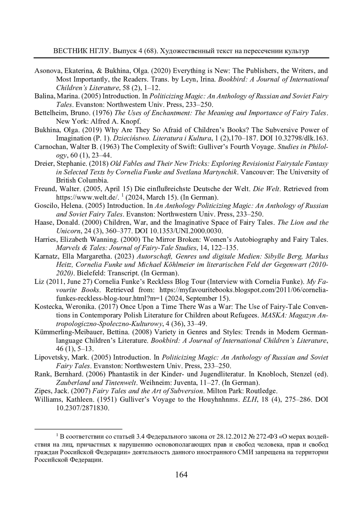 5. Asonova, Ekaterina, & Bukhina, Olga. (2020) Everything is New: The Publishers, the Writers, and Most Importantly, the Readers. Trans. by Leyn, Irina. Bookbird: A Journal of International Children’s Literature, 58 (2), 1-12. EDN: MGPAUW