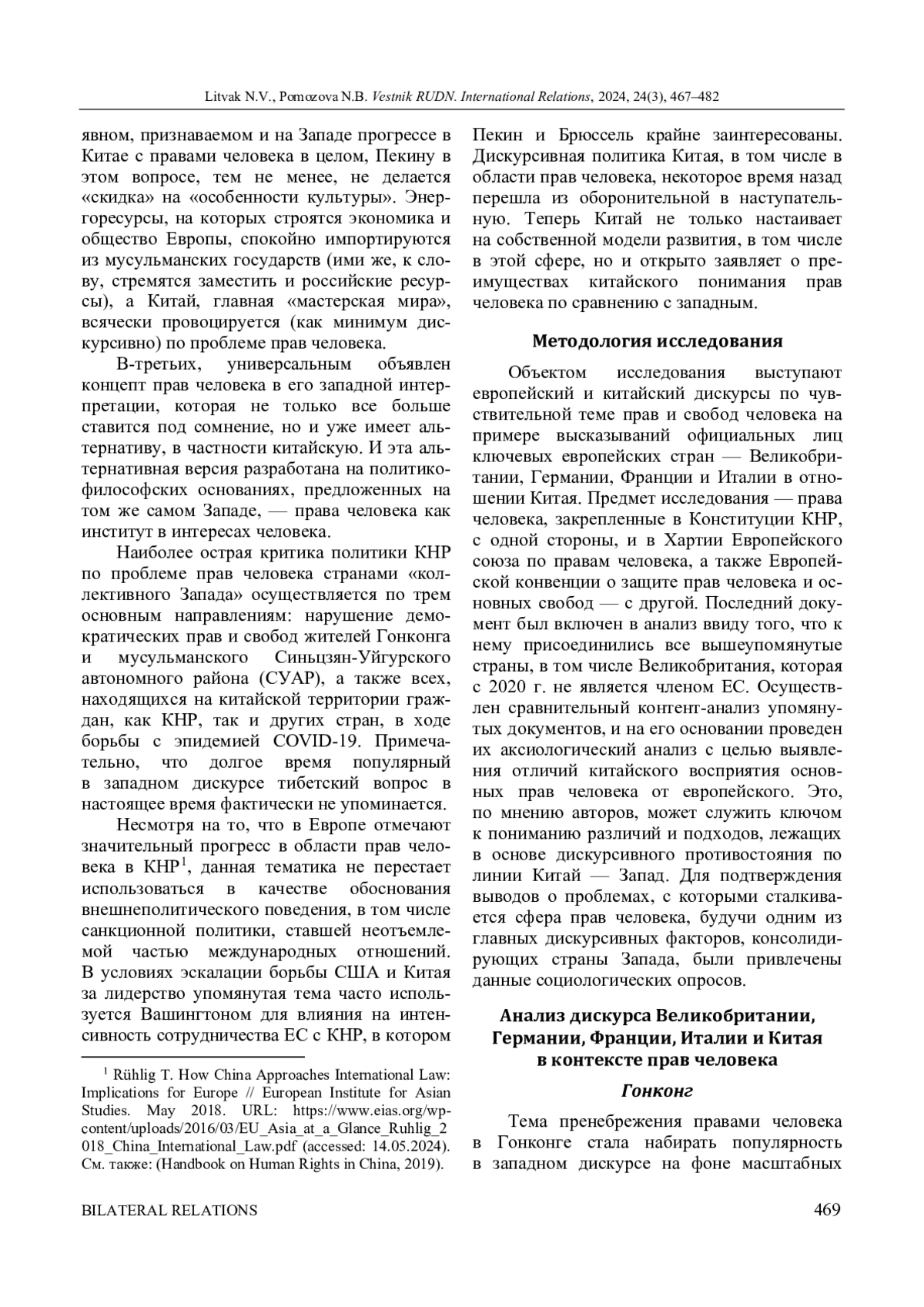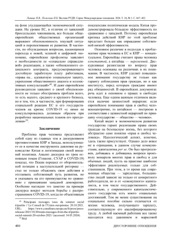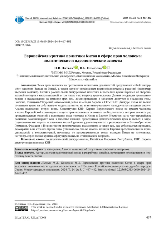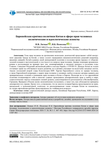 Тема прав человека на протяжении нескольких десятилетий представляет собой инструмент давления Запада на Китай, а также служит оправданием внешнеполитических решений (например, введения санкций). Китай в рамках своей дискурсивной политики в последнее время перешел от оборонительной позиции к наступательной, в том числе и по вопросу прав человека. Данная тенденция проанализирована в исследовании на примере трех тем, доминировавших в западном дискурсе в последние годы: Гонконг, Синьцзян-Уйгурский автономный район и методы борьбы с COVID-19. Дискурс Китая не только отстаивает право на собственную модель развития, но и активно указывает на недостатки западных систем. Анализ положений второй главы Конституции КНР, Хартии Европейского союза по правам человека, а также Европейской конвенции о защите прав человека и основных свобод позволил авторам выявить ряд принципиальных отличий в понимании прав человека в Китае и Европе. Несмотря на то что европейские политики позиционируют себя в качестве главных проводников демократических прав и свобод в мире, социологические опросы показывают низкий уровень удовлетворенности респондентов в Великобритании, Германии, Франции и Италии своим экономическим положением, а также тем, как соблюдаются принципы демократии в их странах. Кроме того, установлено, что во многом позиция Европы представляется не принципиальной, а конъюнктурной, поскольку по рассматриваемым темам позиции Китая не изменились, но теперь европейская критика сфокусировалась на «тайваньском вопросе».