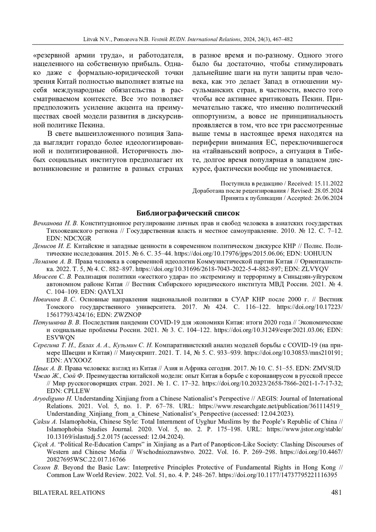 11. Çaksu A. Islamophobia, Chinese Style: Total Internment of Uyghur Muslims by the People’s Republic of China // Islamophobia Studies Journal. 2020. Vol. 5, no. 2. P. 175-198. URL: https://www.jstor.org/stable/ (accessed: 12.04.2024). DOI: 10.13169/islastudj.5.2.0175 EDN: BDSXCE