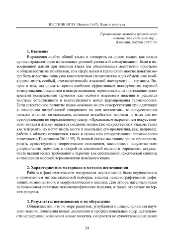 Статья написана в рамках исследования, посвященного поиску концептуального подхода в терминоведческой работе. Терминологии как совокупности лексических единиц, называющих специальные понятия соответствующих областей знания и деятельности человека, формируются под влиянием как естественных факторов, так и искусственного - сознательного воздействия специалистов. С целью определения значимых направлений работы по упорядочению терминологии производится оценка актуального состояния морской терминологии немецкого языка на материале лексикографических источников методами компонентного и морфологического анализа. В качестве методологической основы упорядочения терминологии рассматривается системный подход, предполагающий работу с термином не изолированно, а как с элементом системы терминов. Как показывает исследование, немецкие термины морской отрасли не всегда соответствуют выдвигаемым с учетом системного подхода требованиям к термину. В частности, не в полной мере реализуется принцип структурной согласованности, что проявляется в неоднородности морфемного состава элементов системы терминов, вариативности порядка следования морфем. Наблюдаются случаи синонимии или несоблюдения моносемичности термина, что противоречит принципу соответствия «один к одному» между термином и понятием. Указанные противоречия предлагается преодолевать посредством предваряющего работу с совокупностью терминов выявления системы понятий соответствующей отрасли знания, что подразумевает установление существующих между ними взаимосвязей, отражающих объективные связи между реальными объектами и явлениями, а также актуальный уровень развития технологий и научной мысли. Это позволяет не только устранять явления семантической или формальной избыточности в терминологии, но и выявлять историзмы и даже недостающие элементы, или лакуны. Кроме того, отмечается, что оценка взаимосвязей в системе понятий является необходимым условием построения дефиниции термина, к которой, в отличие от общеупотребительных слов, предъявляется требование точности в отражении научного понятия. Важным условием реализации системного подхода является его повсеместное внедрение как части регламента, определяющего работу с терминологией, и ознакомление с ним специалистов разных областей.