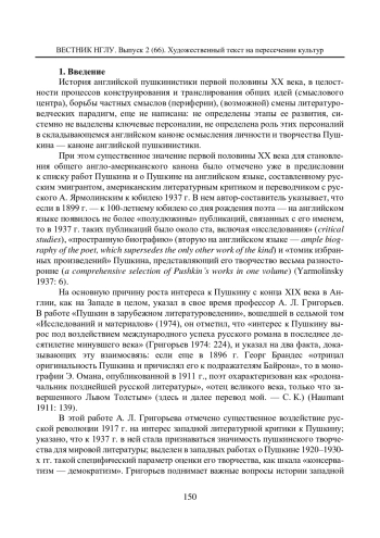 В статье исследуется становление английской пушкинистики в период 10-40-х гг. XX века с акцентом на общей линии осмысления «Полтавы» Пушкина в связи с применением приема сопоставления поэта с Петром I. Доказывается, что этот вопрос не получил должного научного освещения. Делаются промежуточные выводы относительно логики развития английской пушкинистики. Доказывается, что в форме устоявшегося канона она была сформирована к 1950-м гг. в научно-просветительских книгах М. Бэринга, Д. Мирского и Я. Лаврина о Пушкине и русской литературе. Утверждается, что концепция пушкинского творчества повлияла как на книги Лаврина и отчасти Мирского, так и на английскую пушкинистику в целом. Приметой английского пушкиноведческого канона стала культурно-историческая парадигма филологического исследования, совмещенная с этнофилософским подходом к изучению национальной литературы, вниманием к биографии поэта и к общим особенностям художественной формы и содержания произведения. Определено, что на становление канона английской пушкинистики значительное воздействие оказали работы Достоевского и Мережковского о Пушкине. Контекстом, опосредующим это воздействие, выступили имагологические механизмы уподобления и упрощения. С их помощью творчество Пушкина было вписано в такие близкие английскому читателю понятийные категории, как «европейское», «английское», «универсальное», «гениальное», «человечное». Выявлено, что «русское» на примере Пушкина (и Петра) представало одновременно вбирающим в себя «европейское», присваивающим его и - входящим в «европейское», расширяющим его изнутри. Доказано, что монография Джона Бейли «Пушкин. Сравнительный комментарий» (1971) открывает собой новую страницу в истории английской пушкинистики. Уходя от культурно-исторического метода и этнофилософского подхода к литературе, исключая работу имагологических механизмов в литературоведческом исследовании, эта книга предлагает новые ориентиры: сравнительно-историческую парадигму в сочетании с методикой пристального чтения и вниманием к советскому пушкиноведению.