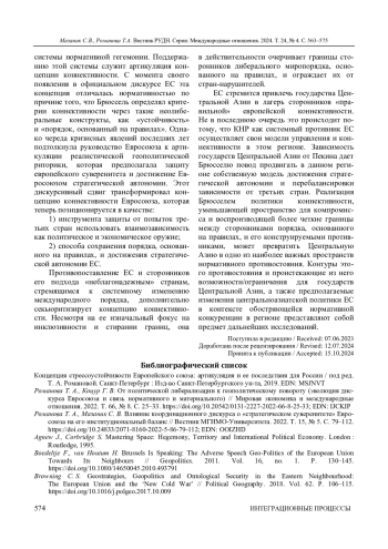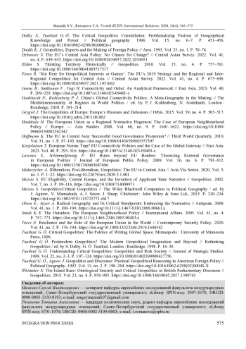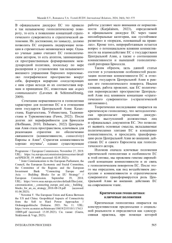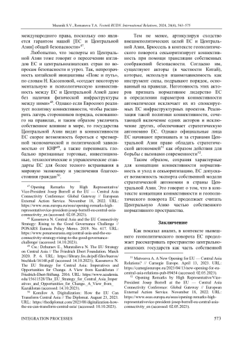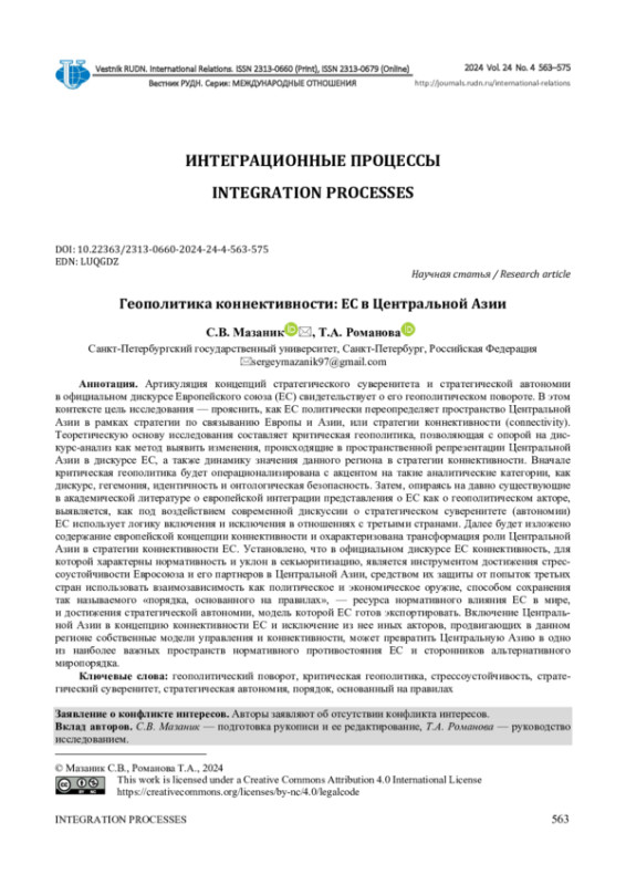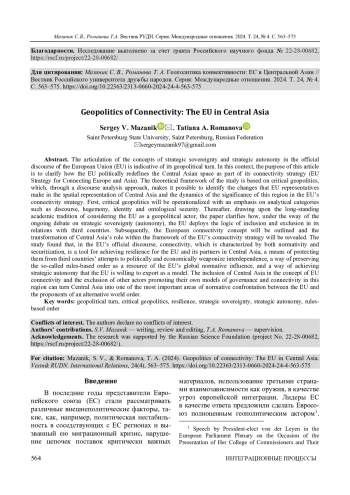 МАЗАНИК С. В., РОМАНОВА Т. А. ГЕОПОЛИТИКА КОННЕКТИВНОСТИ: ЕС В ЦЕНТРАЛЬНОЙ АЗИИ // ВЕСТНИК РОССИЙСКОГО УНИВЕРСИТЕТА ДРУЖБЫ НАРОДОВ. СЕРИЯ: МЕЖДУНАРОДНЫЕ ОТНОШЕНИЯ. 2024. ТОМ 24 № 4