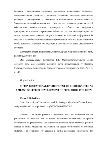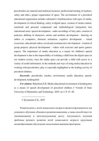 В статье представлено теоретическое обоснование и прокомментированы возможности эффективного использования медиаобразовательной среды в развитии речи дошкольников. Проведенное теоретическое исследование показало позитивное влияние медиаобразовательной среды на развитие речи детей дошкольного возраста. Условиями создания медиаобразовательной среды для дошкольников являются материально-технические ресурсы, профессиональная подготовка педагогов, безопасность и этичность, правильная организация пространства. Среда дошкольной образовательной организации включает содержательный (знакомство с видами медиа, развитие критического мышления, безопасность в цифровом пространстве, создание медиаконтента, эмоционально-личностный компонент) и методический (интеграцию в образовательные области: речевое развитие - аудиозаписи сказок, создание подкастов, озвучивание персонажей; художественно-эстетическое развитие - рисование на планшетах или компьютерах, анимация персонажей; познавательное развитие - виртуальные экскурсии, обучающие видеоролики; социально-коммуникативное развитие - создание групповых проектов; физическое развитие - видеоролики с зарядками и спортивными играми) аспекты. Значимость медиаобразования как средства для речевого развития детей обусловлена невозможностью изолировать ребенка от цифрового пространства в нашем современном обществе, так как медиапространство может предоставить ребенку доступ к множеству полезной информации. В методах и способах применения медиаобразования в работе с дошкольниками особо выделены игровые как ведущие в деятельности детей дошкольного возраста.