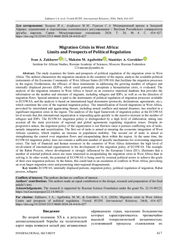 Рассматриваются ограничения и перспективы политического регулирования миграционного кризиса в Западной Африке. Охарактеризована миграционная ситуация в странах региона, проанализированы имеющиеся политические инструменты Экономического сообщества стран Западной Африки (ЭКОВАС) для регулирования миграционных процессов и дана оценка их эффективности в решении проблемы беженцев и внутренне перемещенных лиц (ВПЛ), угрожающей гуманитарной катастрофой для государств региона. Анализ миграционной ситуации в Западной Африке опирается на статистическую базу данных о численности и структуре мигрантов, а также о направленности миграционных потоков. Особое внимание уделено инструментам политического регулирования миграционных процессов со стороны ЭКОВАС, изучение которых опирается на международные правовые документы (декларации, соглашения и т. д.), составляющие основу миграционной политики на региональном уровне. Интенсификация вынужденных миграций в Западной Африке, спровоцированная взаимосвязанными и усугубляющими угрозами, к которым относятся вооруженные конфликты и природные бедствия, привела к миграционному кризису в регионе. Анализ правовой базы на уровне ЭКОВАС свидетельствует о том, что эта международная организация достаточно оперативно реагирует на масштабный рост числа беженцев и ВПЛ. Миграционная политика ЭКОВАС отличается высоким уровнем проработки, учитывает все основные положения региональных и глобальных соглашений, регламентирующих вопросы миграции. Несмотря на прогрессивный характер, миграционная политика организации не лишена недостатков, поскольку она преследует противоречащие друг другу группы задачи - интеграцию и секьюритизацию. Первая группа задач призвана обеспечить экономическую интеграцию стран Западной Африки за счет обеспечения роста мобильности населения, вторая - направлена на усиление контроля за миграционными потоками и их капсулизацию внутри региона. Вместе с тем в миграционной политике ЭКОВАС отсутствует достаточное количество конкретных механизмов преодоления миграционных кризисов. Нехватка финансовых и кадровых ресурсов государств Западной Африки определяет высокий уровень вовлеченности в миграционную политику ЭКОВАС иных международных организаций. На примере Рабатского процесса, развитие которого во многом диктуется Европейским союзом (ЕС), показано, что ряд внешних политических акторов заинтересован не столько в разрешении миграционного кризиса в Западной Африке, сколько в его капсулизации, а потенциал ЭКОВАС используется ими для достижения целей собственной миграционной политики. В перспективе это может привести к эскалации конфликтов в Западной Африки и спровоцировать еще более масштабный миграционный кризис.