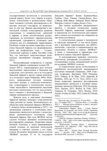 15. Сидорова Г. М. Трансграничная миграция в Африке в условиях военно-политических конфликтов // Геополитика и экогеодинамика регионов. 2022. Т. 8, № 3. С. 60-67. EDN: XFGZSD