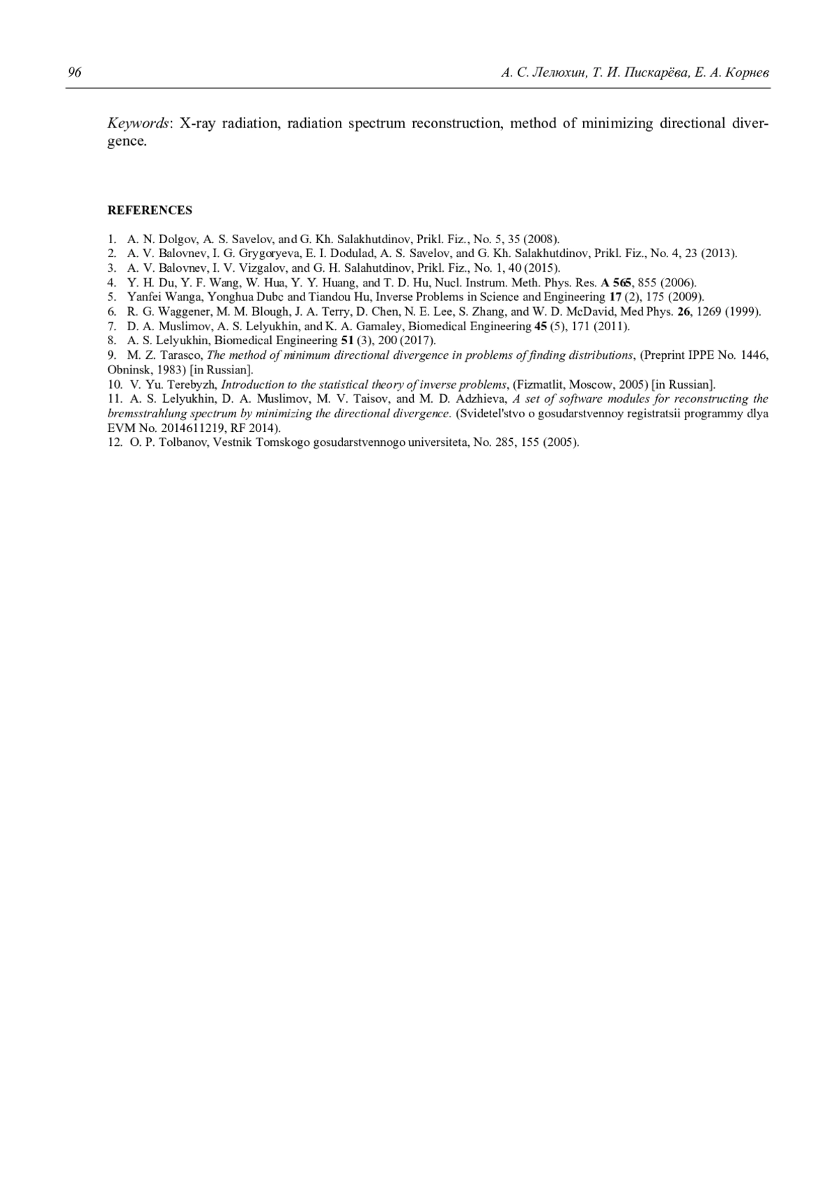 11. A. S. Lelyukhin, D. A. Muslimov, M. V. Taisov, and M. D. Adzhieva, A set of software modules for reconstructing the bremsstrahlung spectrum by minimizing the directional divergence. (Svidetel’stvo o gosudarstvennoy registratsii programmy dlya EVM No. 2014611219, RF 2014).
