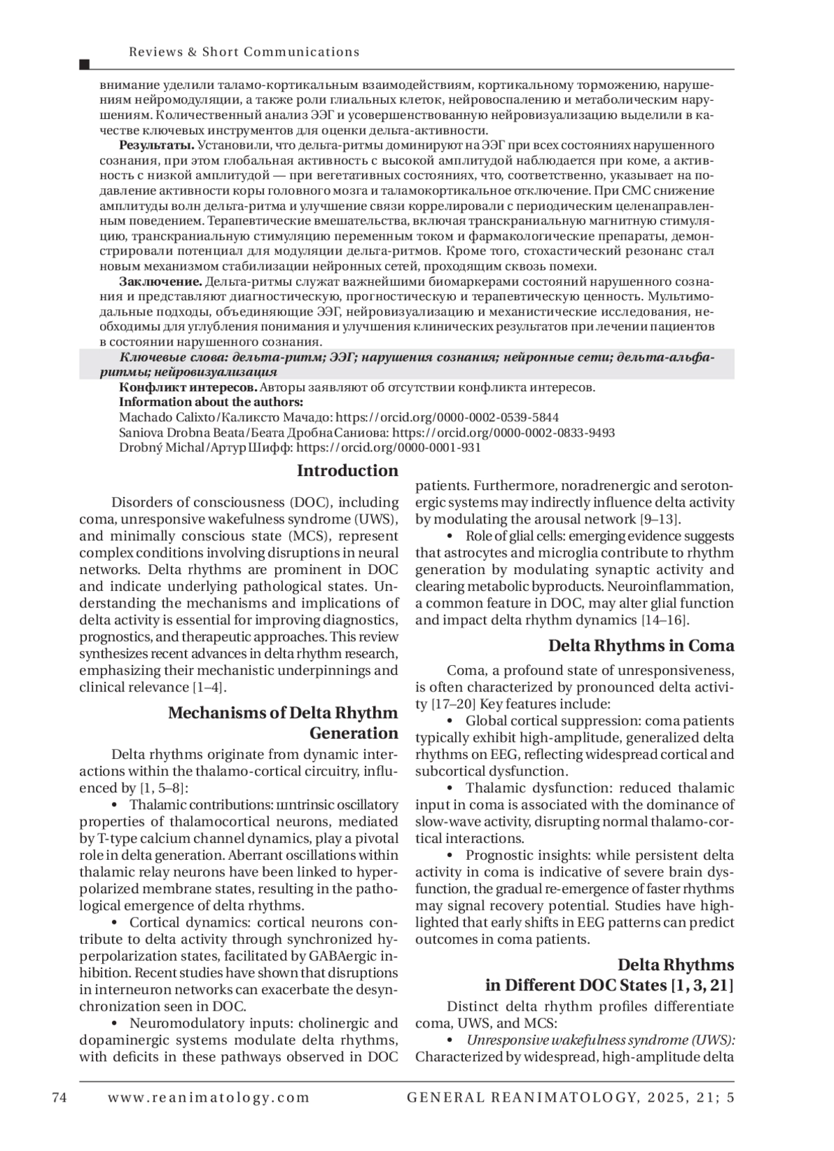 Заключение. Дельта-ритмы служат важнейшими биомаркерами состояний нарушенного сознания и представляют диагностическую, прогностическую и терапевтическую ценность. Мультимодальные подходы, объединяющие ЭЭГ, нейровизуализацию и механистические исследования, необходимы для углубления понимания и улучшения клинических результатов при лечении пациентов в состоянии нарушенного сознания.
