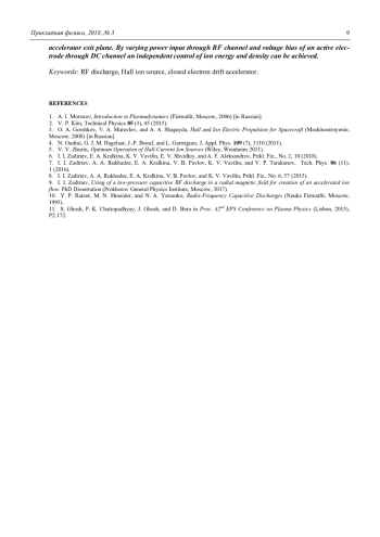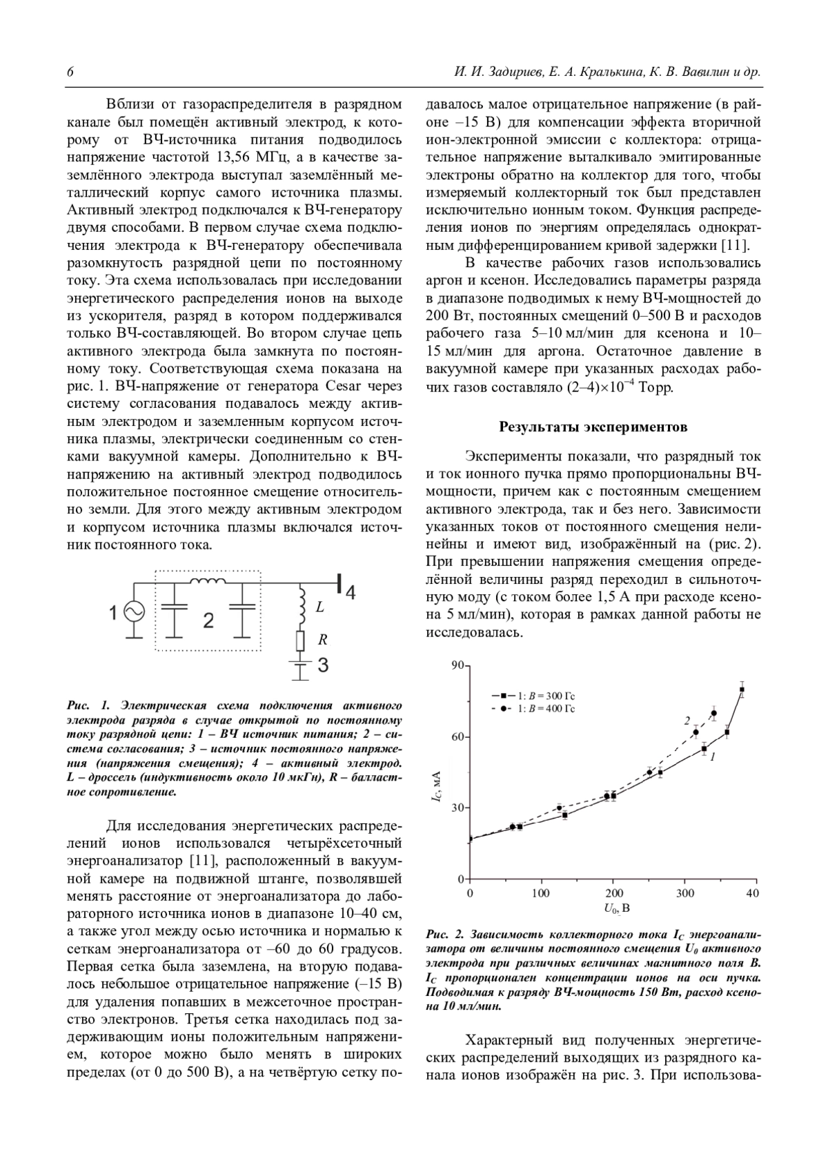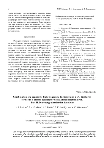 Комбинация емкостного высокочастотного разряда и разряда постоянного тока для использования в плазменном ускорителе с замкнутым дрейфом электронов. Часть II. Функции распределения ионов по энергиям Задириев И. И., Кралькина Е. А., Вавилин К. В., Швыдкий Е. В., Александров А. Ф. 5