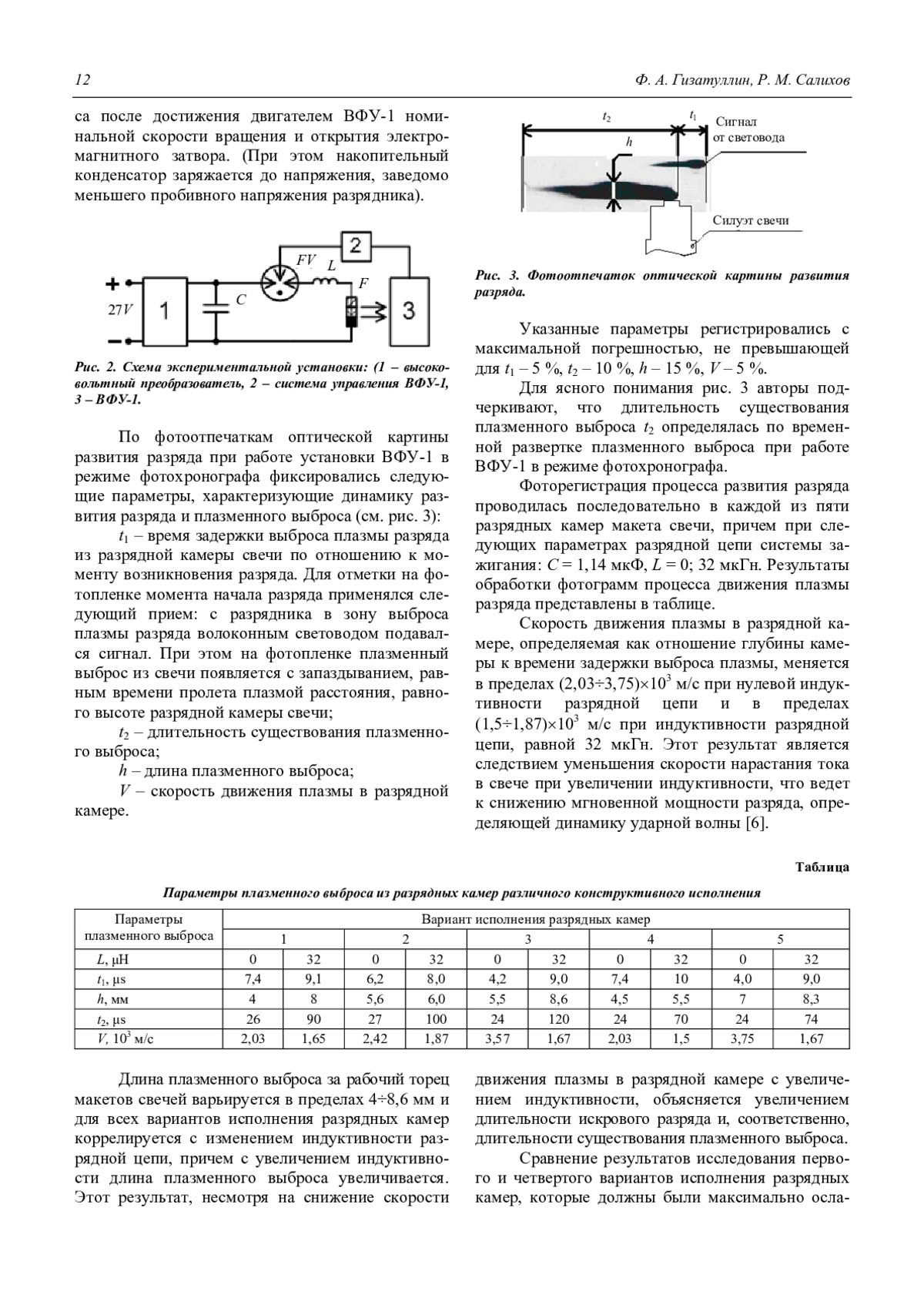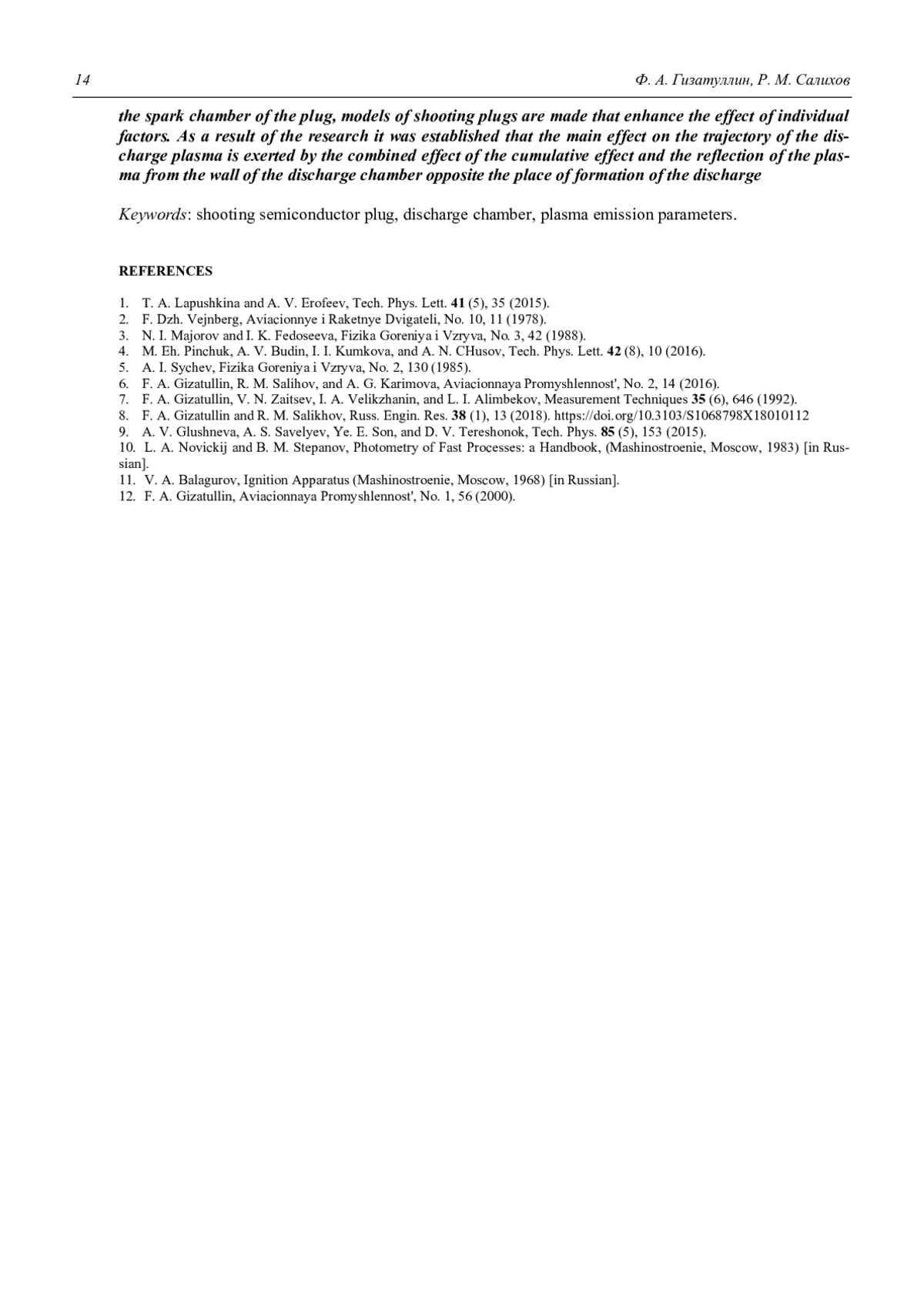 Влияние особенностей разрядных камер стреляющих полупроводниковых свечей газотурбинных двигателей на характеристики плазменного выброса Гизатуллин Ф. А., Салихов Р. М. 10