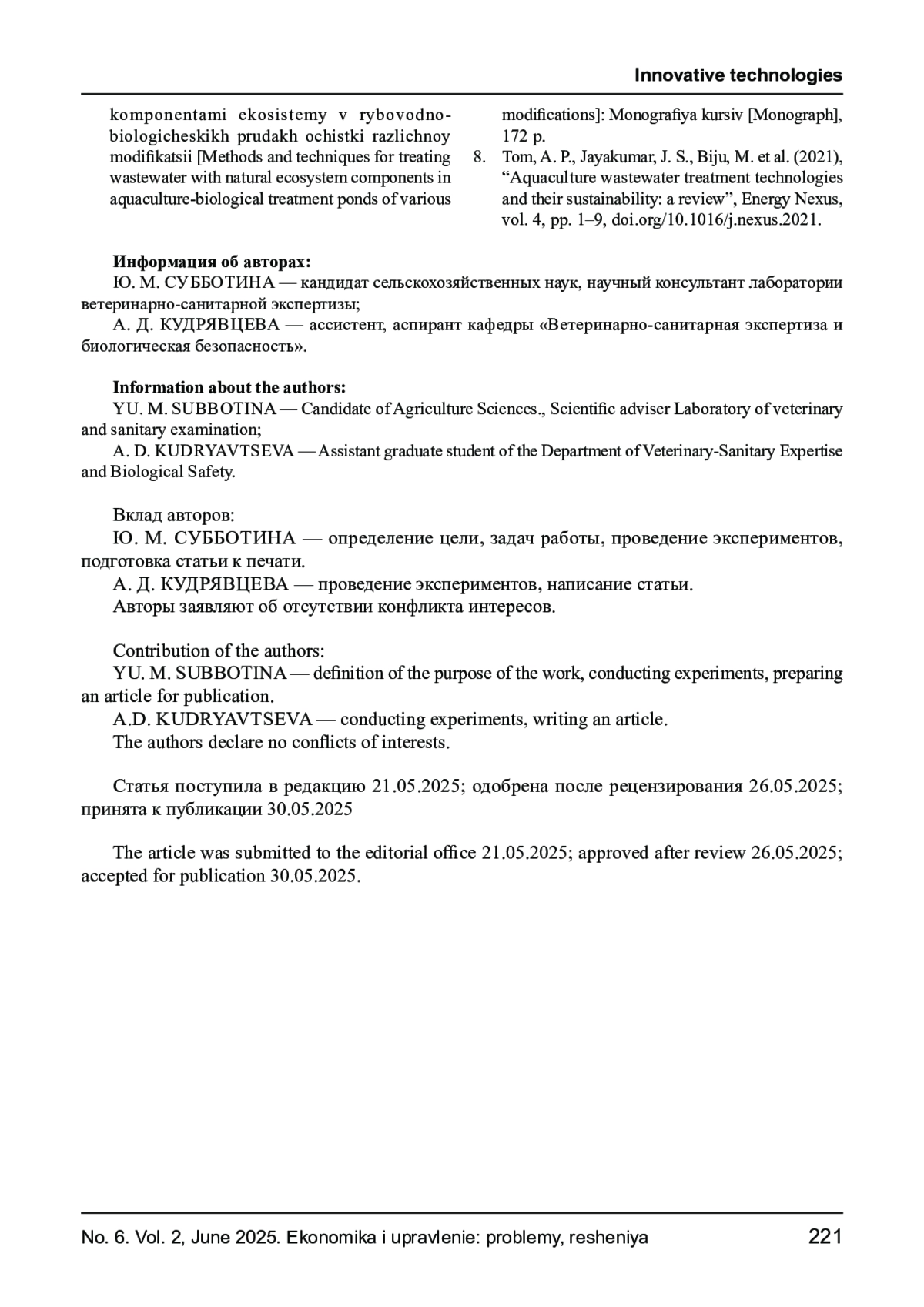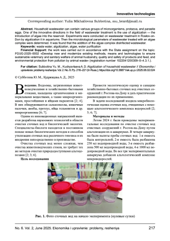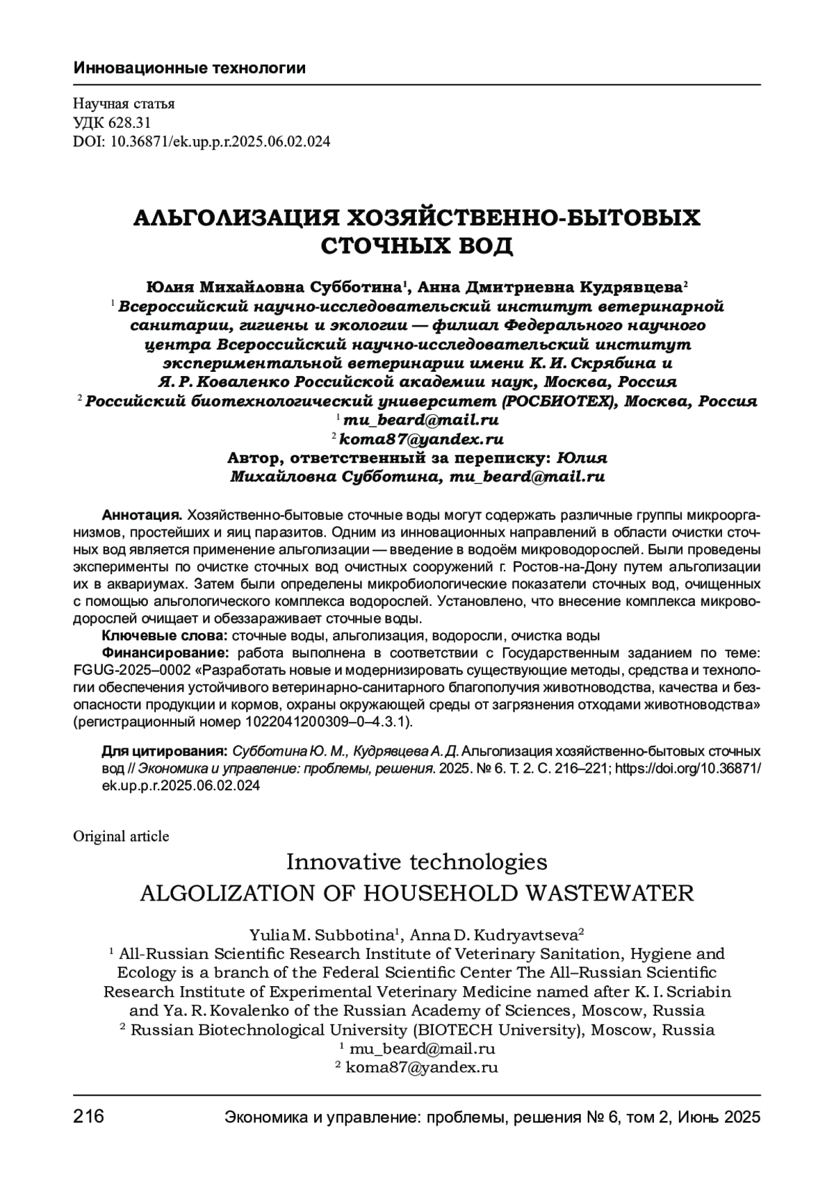СУББОТИНА Ю. М., КУДРЯВЦЕВА А. Д. АЛЬГОЛИЗАЦИЯ ХОЗЯЙСТВЕННО-БЫТОВЫХ СТОЧНЫХ ВОД // ЭКОНОМИКА И УПРАВЛЕНИЕ: ПРОБЛЕМЫ, РЕШЕНИЯ. 2025. ТОМ 2 № 6