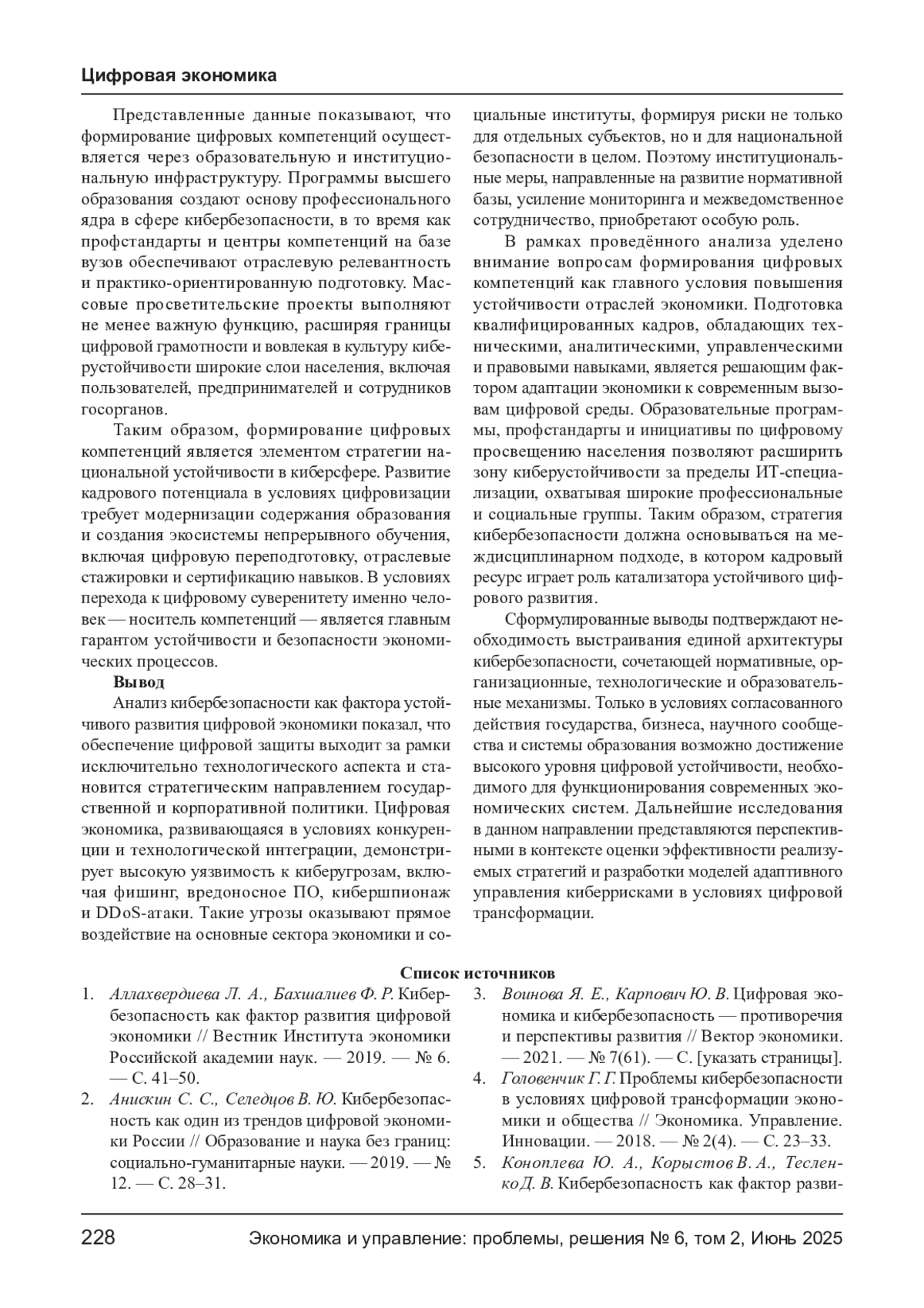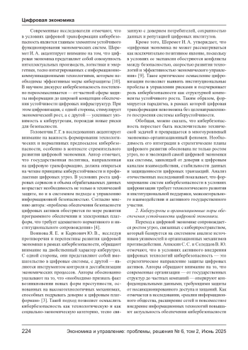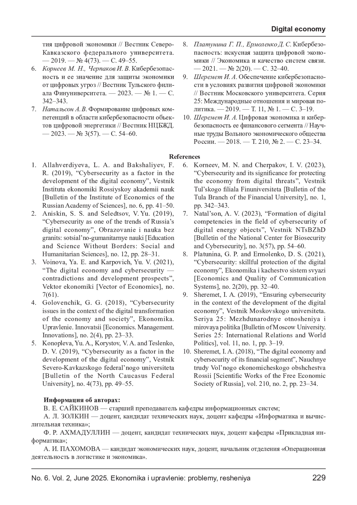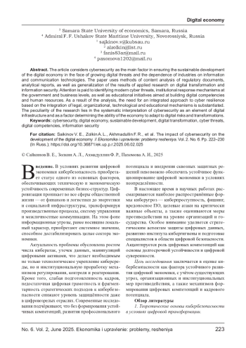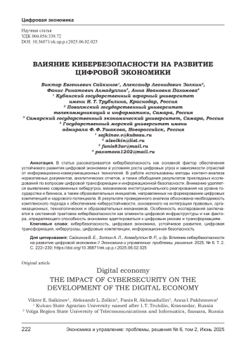САЙКИНОВ В. Е., ЗОЛКИН А. Л., АХМАДУЛЛИН Ф. Р., ПАХОМОВА А. И. ВЛИЯНИЕ КИБЕРБЕЗОПАСНОСТИ НА РАЗВИТИЕ ЦИФРОВОЙ ЭКОНОМИКИ // ЭКОНОМИКА И УПРАВЛЕНИЕ: ПРОБЛЕМЫ, РЕШЕНИЯ. 2025. ТОМ 2 № 6