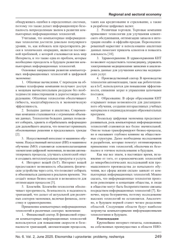 Развитие интернет-технологий вызвало потрясающие изменения в жизни и работе людей и в определенной степени способствовало развитию общества. С постоянным обновлением и прогрессом компьютерных технологий области их применения станут более обширными и тесно связанными с жизнью людей. В статье представлены основные концепции компьютерных информационных технологий, проанализированы типичные области применения вычислительных технологий на данном этапе и направления развития и применения в контексте цифровой экономики. Обсуждаются ключевые технологии, такие как облачные вычисления, большие данные, искусственный интеллект, интернет вещей и блокчейн, а также их влияние на различные секторы экономики, включая финансы, розничную торговлю, здравоохранение, производственный сектор и образование.