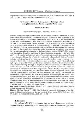 Статья: ОБРАЗНО-ЦЕННОСТНЫЙ КОМПОНЕНТ ЛИНГВОКУЛЬТУРНОГО КОНЦЕПТА РОДСТВО В РУССКОЙ ЯЗЫКОВОЙ КАРТИНЕ МИРА (2024)