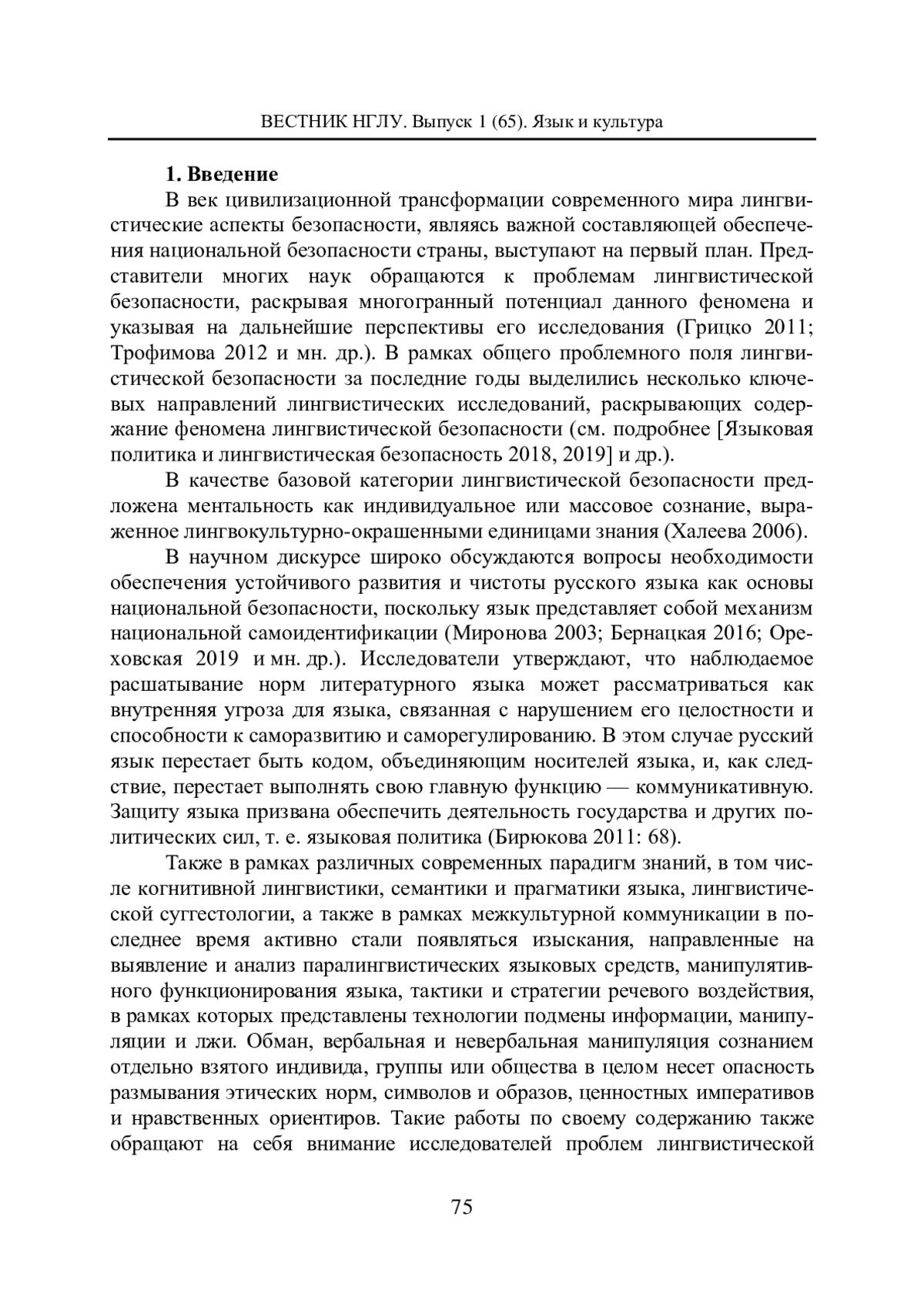 В век цивилизационной трансформации современного мира лингвистические аспекты безопасности, являясь важной составляющей обеспечения национальной безопасности страны, выступают на первый план. Представители многих наук обращаются к проблемам лингвистической безопасности, раскрывая многогранный потенциал данного феномена и указывая на дальнейшие перспективы его исследования (Грицко 2011; Трофимова 2012 и мн. др.). В рамках общего проблемного поля лингвистической безопасности за последние годы выделились несколько ключевых направлений лингвистических исследований, раскрывающих содержание феномена лингвистической безопасности (см. подробнее [Языковая политика и лингвистическая безопасность 2018, 2019] и др.).