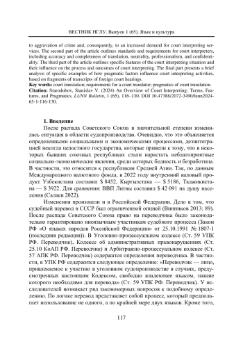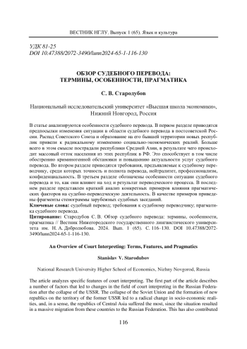 В статье анализируются особенности судебного перевода. В первом разделе приводятся предпосылки изменения ситуации в области судебного перевода в постсоветской России. Распад Советского Союза и образование на его бывшей территории новых республик привели к радикальному изменению социально-экономических реалий. Больше всего в этом смысле пострадали республики Средней Азии, в результате чего происходит массовый отток населения из этих республик в РФ. Это способствует в том числе обострению криминогенной обстановки и повышению актуальности услуг судебного перевода. Во втором разделе приводятся требования, предъявляемые к судебному переводчику, среди которых точность и полнота перевода, нейтралитет, профессионализм, конфиденциальность. В третьем разделе обозначены особенности ситуации судебного перевода и то, как они влияют на ход и результат переводческого процесса. В последнем разделе представлен краткий анализ конкретных примеров влияния прагматических факторов на судебно-переводческую деятельность. В качестве примеров приведены фрагменты стенограммы зарубежных судебных заседаний.