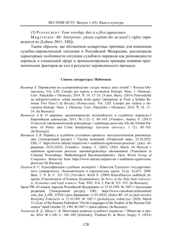 1. Вальтер Х. Переводчик на судопроизводстве: солдат между двух огней? // Rossica Olomucensia. Vol. LIII: Сasopis pro ruskou a slovanskou filologii. Num. 1. Olomouc: Univ. Palackého v Olomouci, 2014. Ñ. 18. 17-24.